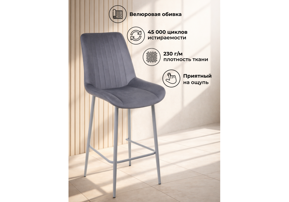 Материал каркаса - металл; Материал сиденья - велюр; Материал обивки - велюр; Цвет ножек - серый; Ширина - 49; Глубина - 57; Высота - 102; Ширина сиденья - 47; Глубина сиденья - 41; Высота сиденья - 63;