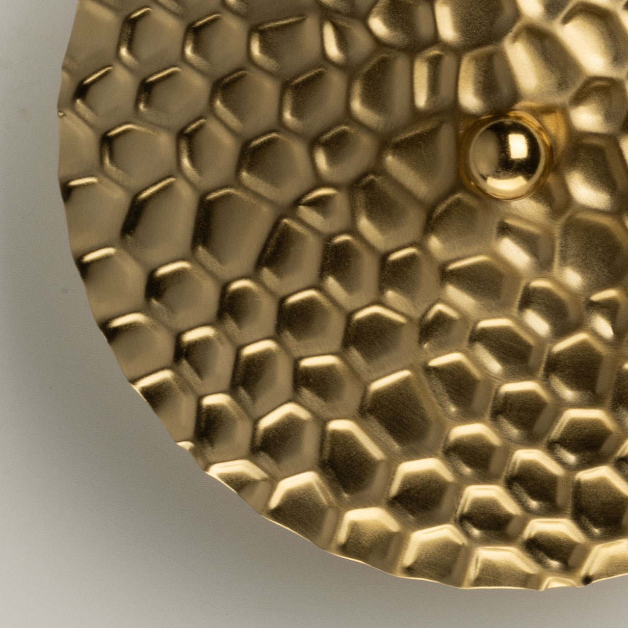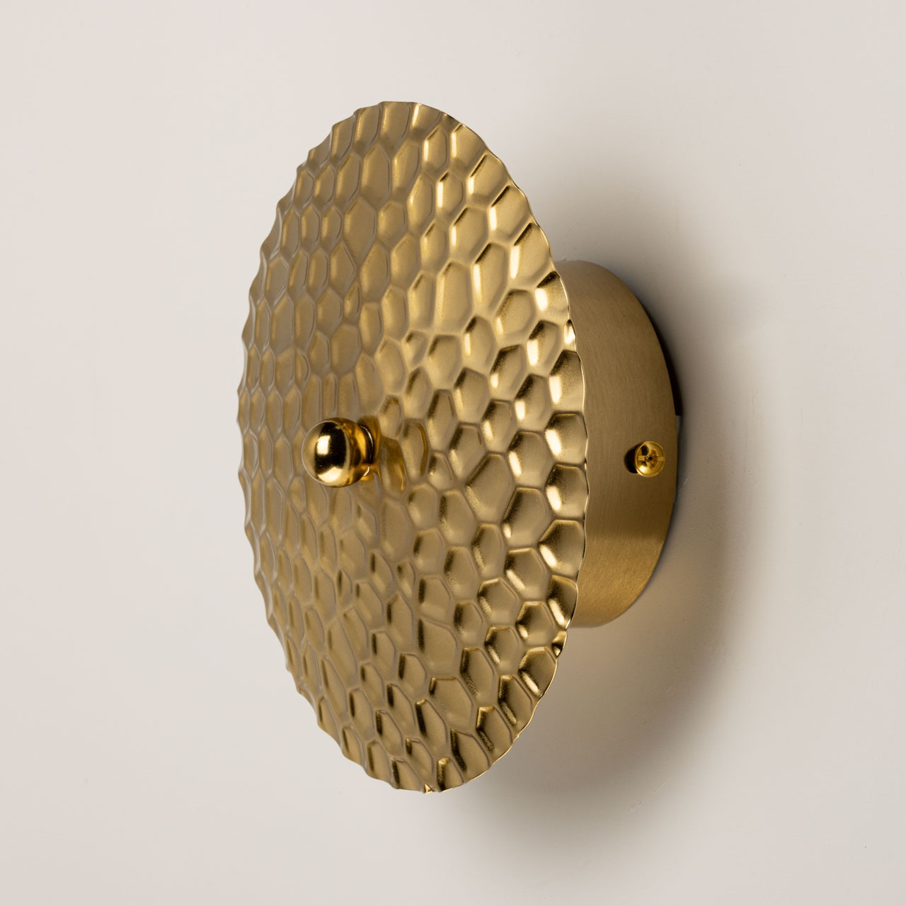 Металлическое основание настенного бра гальванизировано в цвет латуни. Плафон выполнен из сплава алюминия с цинком и гальванизирован в цвет основания. Настенное бра декорировано плафоном из металла с рельефной текстурой.