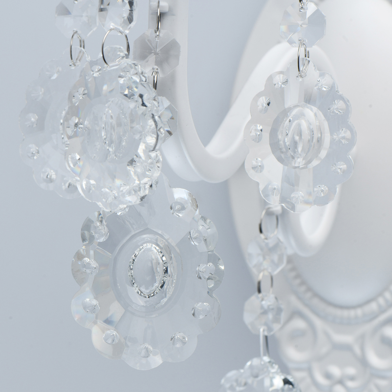 Основание светильника выполнено из металла и окрашено в белый цвет. Светильник декорирован прозрачным хрусталем оригинальной формы.
