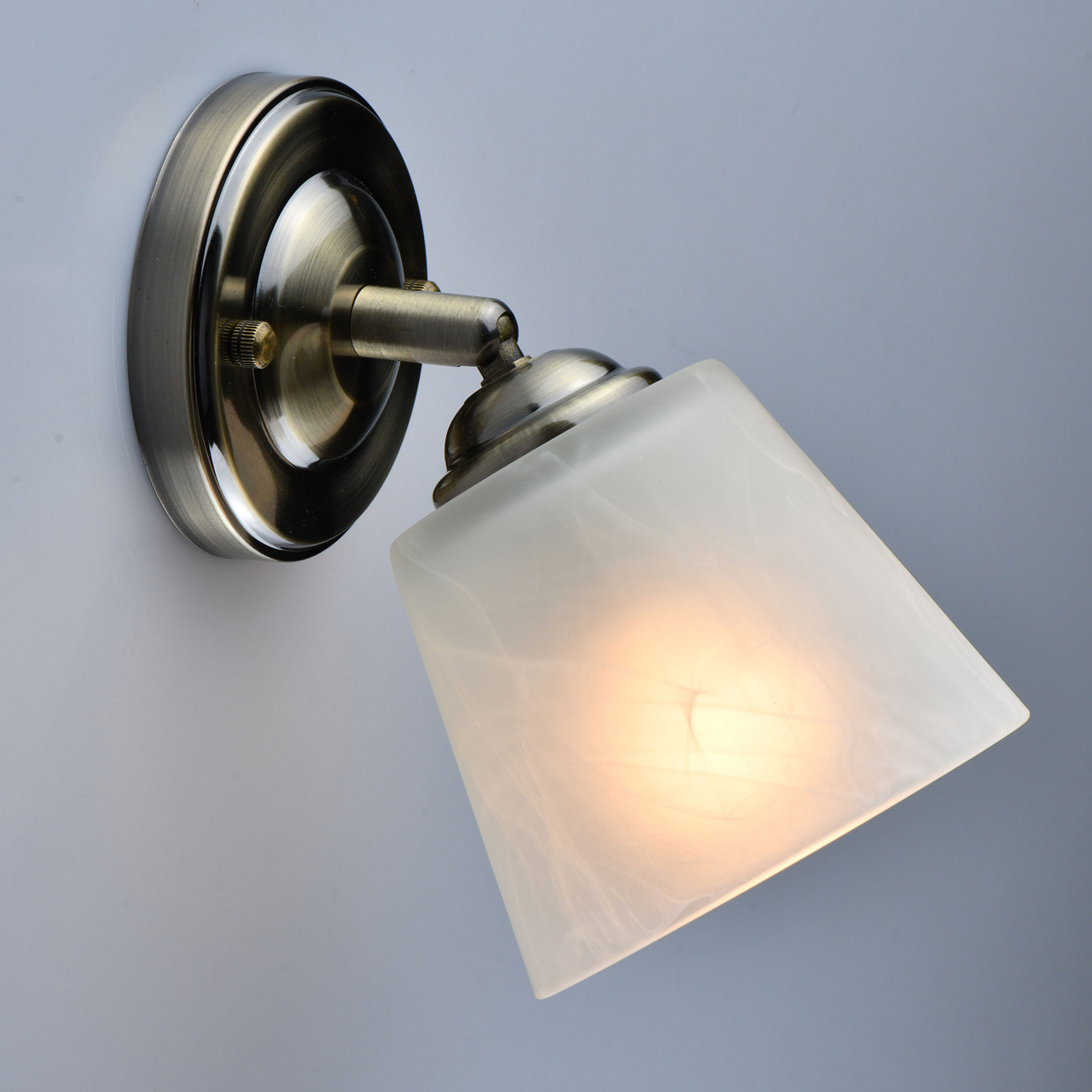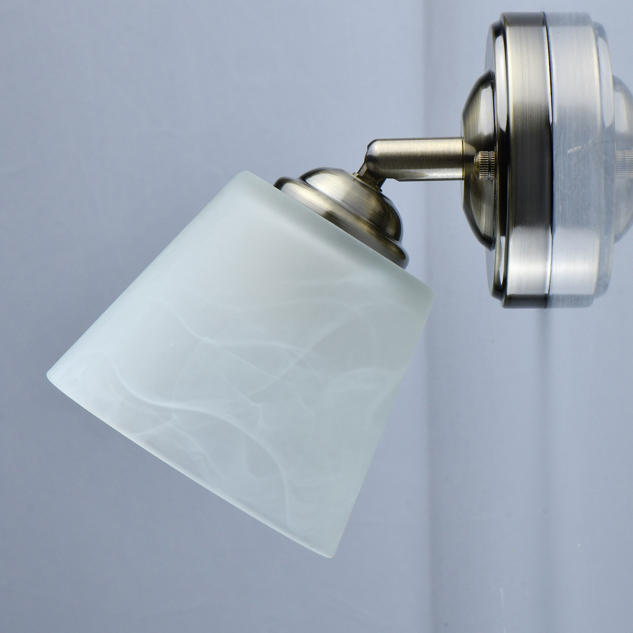 Основание светильника выполнено из металла и гальванизировано в цвет античной бронзы. Светильник декорирован плафонами, выполненными из алебастрового стекла.