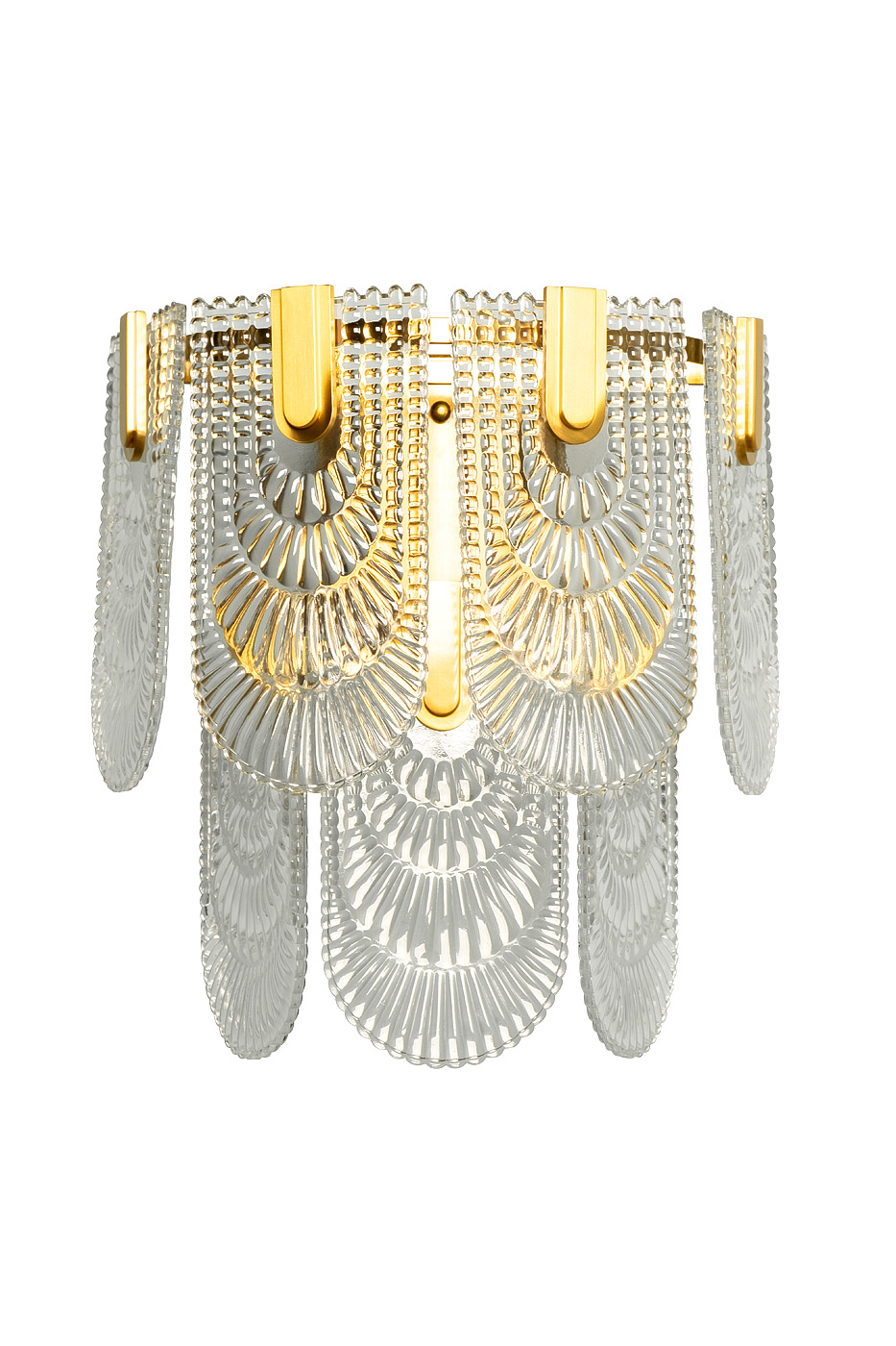 Дизайнерский светильник бра в стиле ар-деко сочетает в себе легкость прозрачного стекла и изысканность позолоченного металла. Оригинальные кружевные подвесы добавляют ему аристократизма и вносят настроение роскоши в обстановку. Стеклянные бра в гостиной играют ключевую декоративную роль – они делают световой акцент на панно, зекрала или картины, а также являются самостоятельным элементом настенного декора. Бра позволяют осветить конкретную зону, сконцентрировав все внимание на ней, или добавить мягкого свечения в комнату.