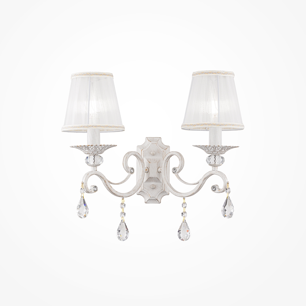 Плафоны бра выполнены из белой органзы, а арматура, украшенная хрустальными подвесами и шарами, изготовлена из белого металла. В светильнике предусмотрено две лампы накаливания с типом цоколя Е14 и мощностью 40 Вт каждая. Общая мощность составляет 80 Вт, что обеспечивает комфортное освещение на площади до 4 квадратных метров. Бра крепится на стену на планку и имеет размеры: ширина — 39 см, высота — 39 см, длина — 25 см. Расширенная гарантия на товар составляет 18 месяцев.