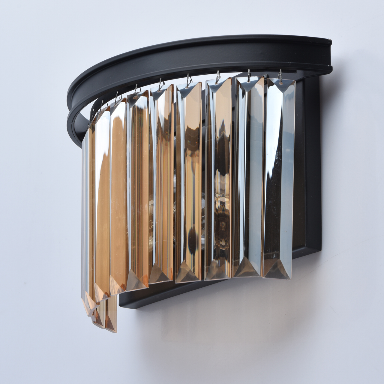 Основание бра выполнено из металла и окрашено в черный матовый цвет. Светильник декорирован хрусталем прямоугольной формы, гальванизированным в цвет шампань.