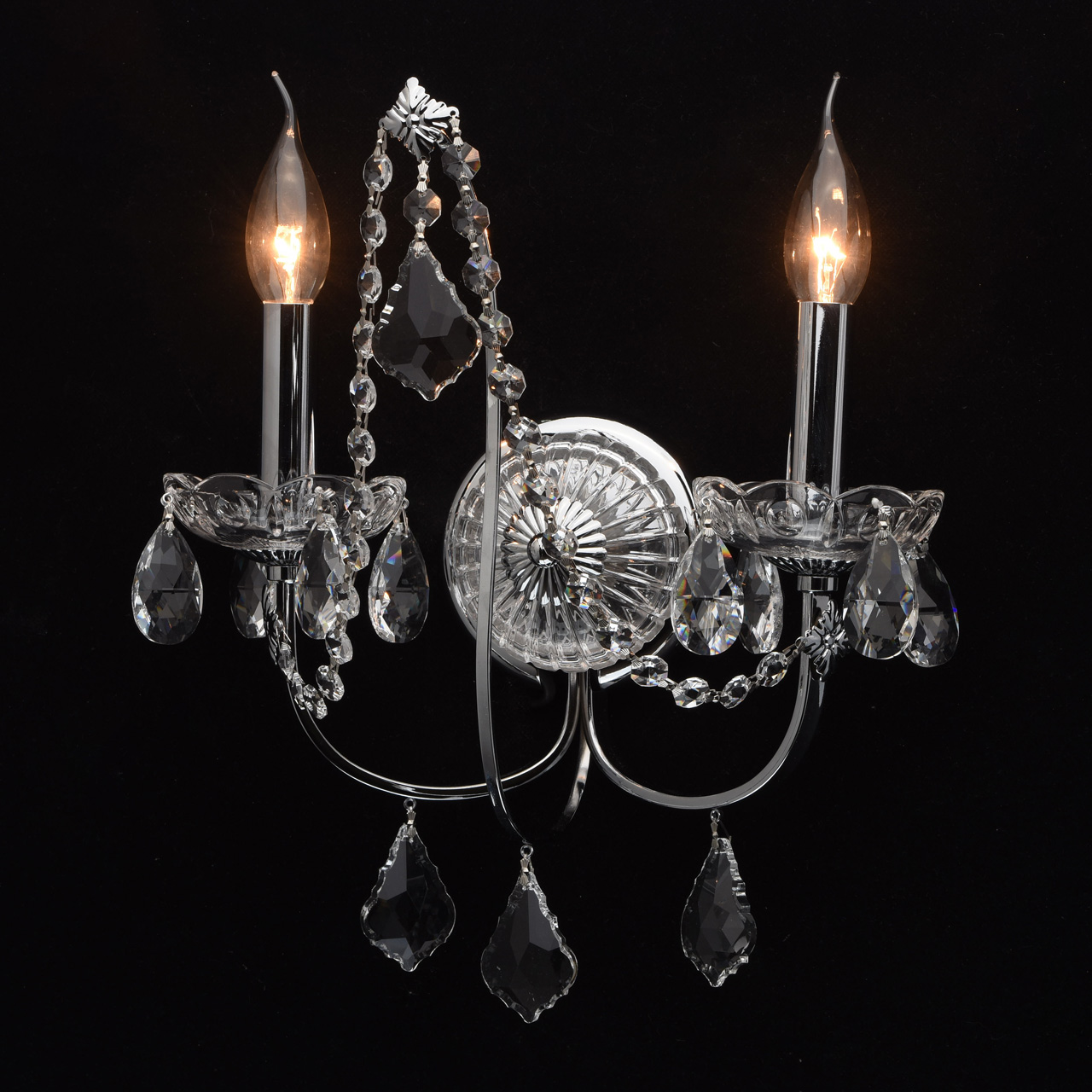 Арматура бра выполнена из сплава железа и гальванизирована в цвет хрома. Основание декорировано прозрачным стеклом со сложным орнаментом. Розетки выполнены из прозрачного стекла, отлитого по форме. Бра декорировано хрустальными подвесками 3-х видов: октагон, миндаль и дубовый лист.