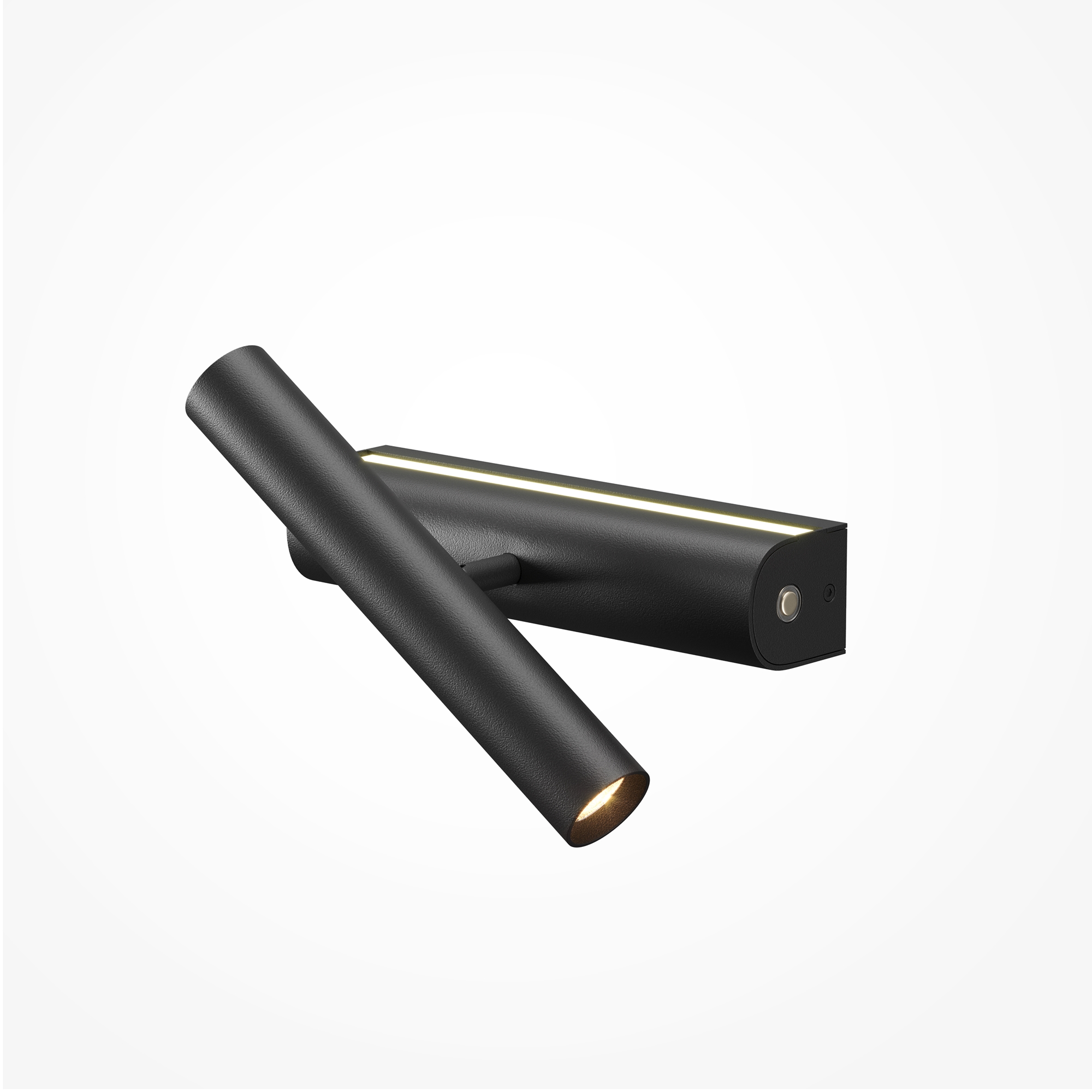 Футуристичный цилиндрический дизайн. Создает как общее заливающее освещение, так и точечную подсветку. Арматура: алюминий; цвет: черный, латунь. Два независимых LED-источника 3000K: скрытая лента с матовым рассеивателем для переотраженного света и поворотный спот для направленного освещения. Углы поворота спота: 350° по горизонтали и 90° по вертикали. Сенсорное управление на корпусе с раздельным включением и диммированием. Для современных интерьеров гостиных, кабинетов и спален.