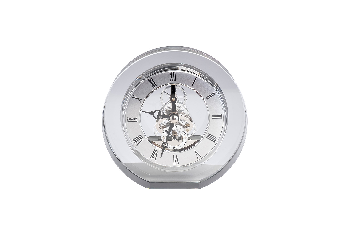 Изысканные настольные часы с прозрачным корпусом из оптического стекла станут стильным украшением рабочего стола, каминной полки или консоли в гостиной. Серебряный циферблат с римскими цифрами и открытым механизмом позволяет наблюдать за ритмичным движени...