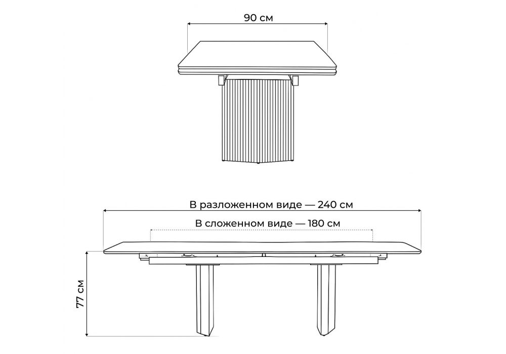 Материал каркаса - металл; Материал столешницы - Керамика; Ширина - 90; Высота - 77; Длина стола в разложенном виде - 240; Длина - 180;