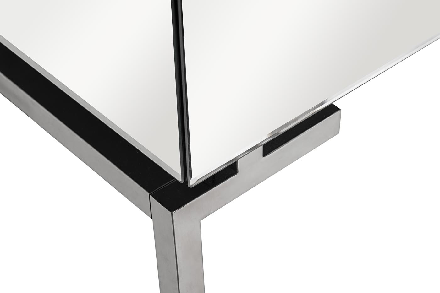Эффектная зеркальная консоль украсит вашу спальную комнату, гостиную или гардероб. Два удобных выдвижных ящика подходят для хранения косметики, украшений, щеток и других мелочей. Опора из полированной стали заменяет традиционные ножки и прекрасно сочетается с серебристым зеркалом столешницы и фасада. Прямые линии и зеркальная облицовка позволяют вписать консоль в интерьер в любом цветовом решении, добавляя в обстановку элементы игры и артистизма.