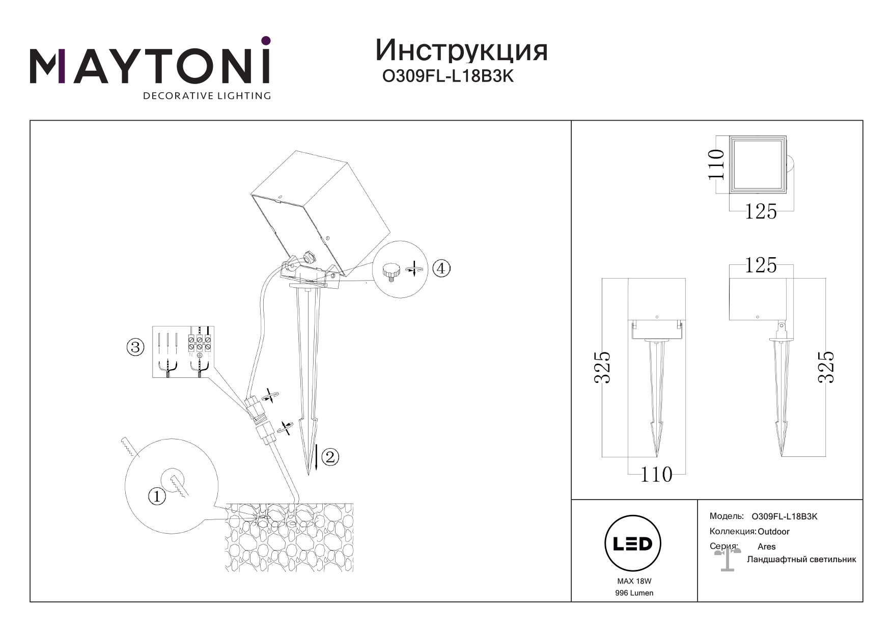 Светильник Ares O309FL-L18B3K имеет размеры: высота — 33 см, ширина — 13 см, глубина — 11 см. Он прост в установке и подходит для использования на улице. Гарантия от производителя составляет 3 года. Технической особенностью является способ крепления на колышек в грунт, а поворотный механизм плафона обеспечивает более направленный свет. Высокая степень защиты IP65 обеспечивает надёжность и долговечность светильника даже при неблагоприятных погодных условиях.