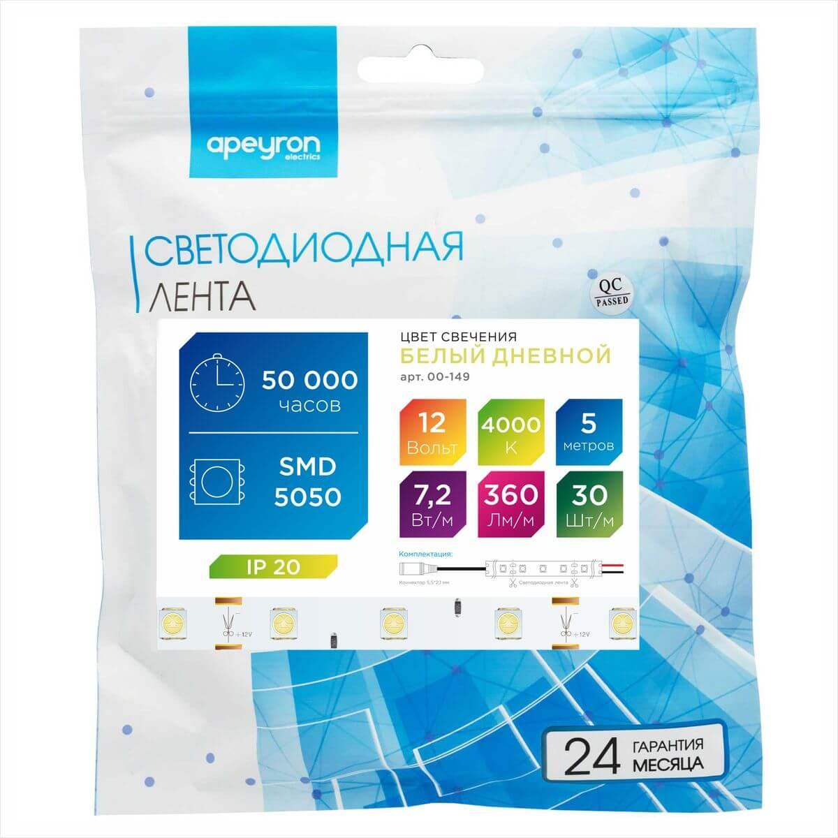 Лента Apeyron 7, 2W/m 30Led/m 5050SMD дневной белый 5M 00-149 в Череповце