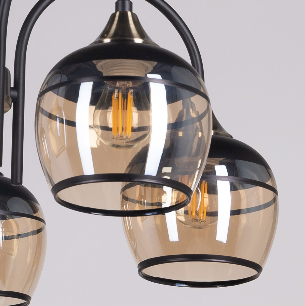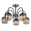 Металлическое основание светильника окрашено в черный цвет. Отдельные элементы основания потолочной люстры гальванизированы в цвет античной бронзы. Потолочная люстра декорирована выдувными вручную стеклянными плафонами, гальванизированными в цвет шампань. У основания плафоны окрашены в черный цвет.