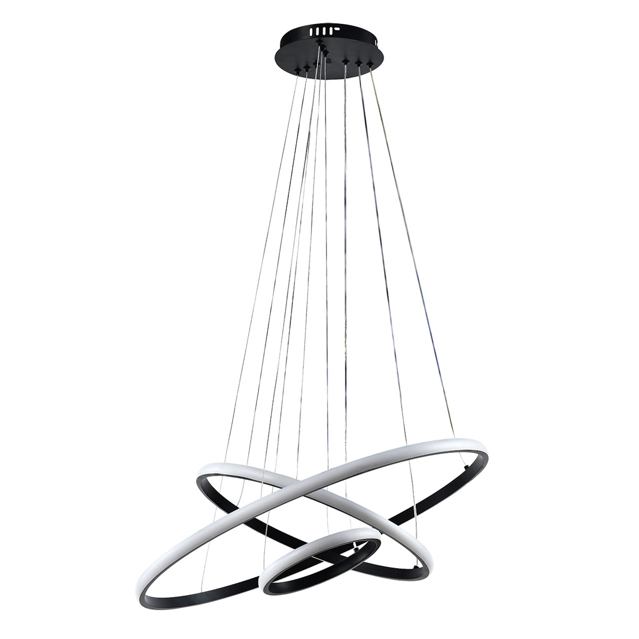 Металлическое основание подвесной люстры окрашено в черный цвет. Корпус плафонов выполнен из сплава алюминия с цинком и окрашен в цвет основания. Светодиодные источники света закрыты белым матовым силиконом.