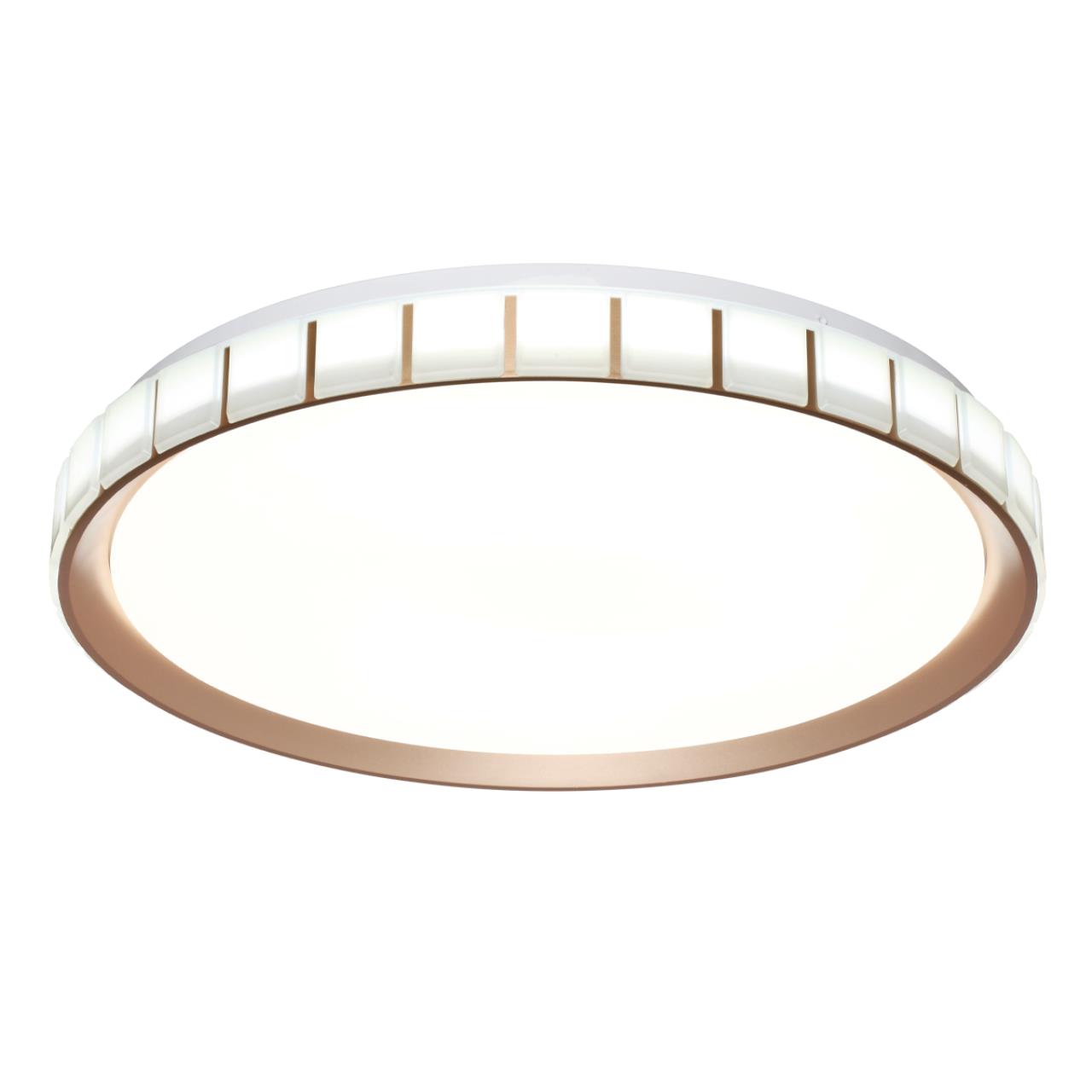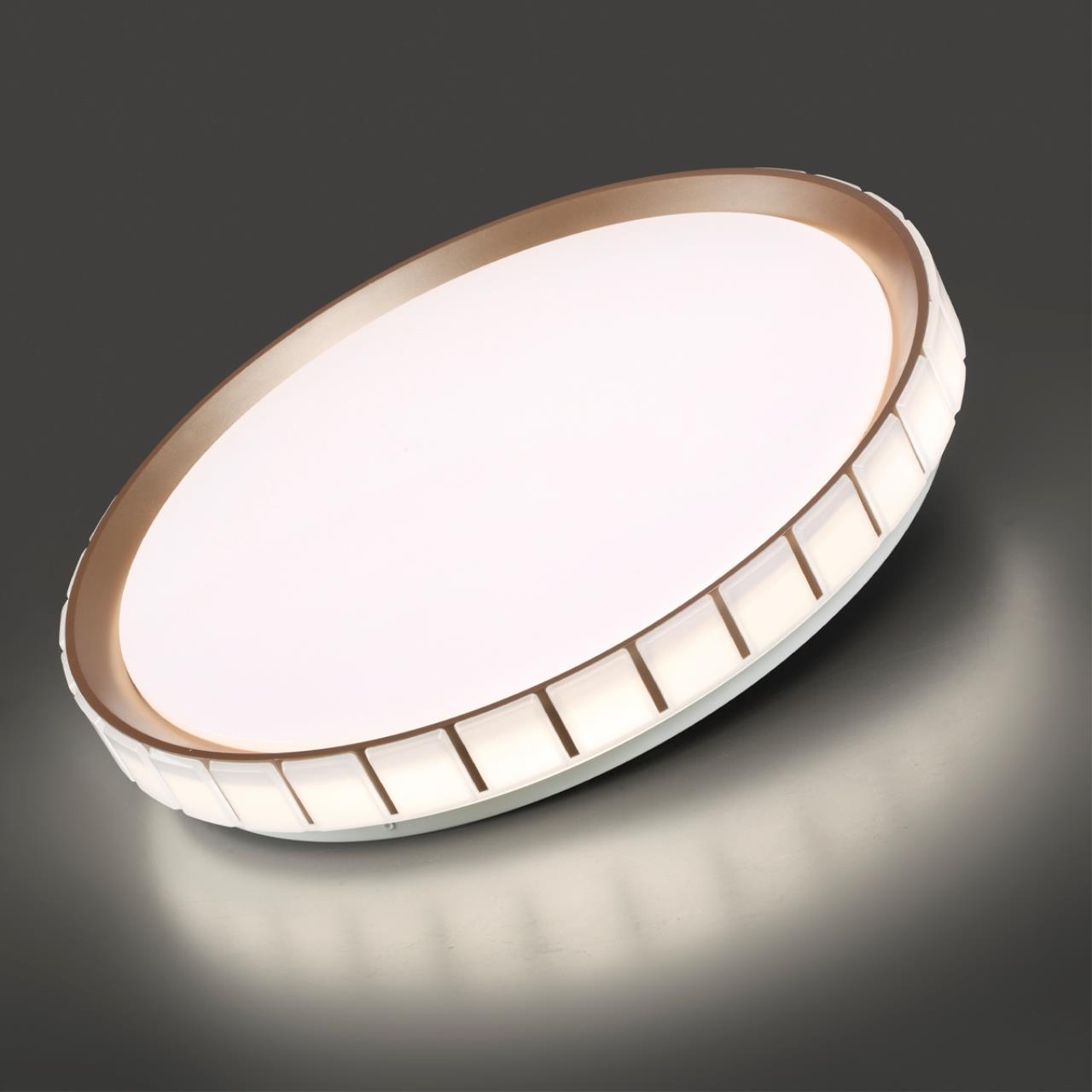 Светильник 7695/EL линии KUPI GOLD состоит из металлического основания (базы) и пластикового рассеивателя. Материал рассеивателя - высококачественный пластик марки PMMA 2.0 белого цвета с матовой, гладкой поверхностью. Пластик обеспечивает светильнику равномерное рассеивание и хорошее светопропускание. Форма плафона: круглая, декорирована рельефным пластиковым светопропускающим ободом, цвет розовое золото. Степень защиты IP43 позволяет использовать светильник в определенных зонах влажных помещений. В комплект входит заменяемый LED модуль с линзами, мощностью 70Вт, которая соответствует лампе накаливания 610Вт. А также пульт ДУ (с креплением на стену), с помощью которого осуществляется плавное изменение цветовой температуры 3000-6000К, изменение яркости, переход в режим переключения теплого/белого/холодного/ночного света. Светильник имеет функцию "память".