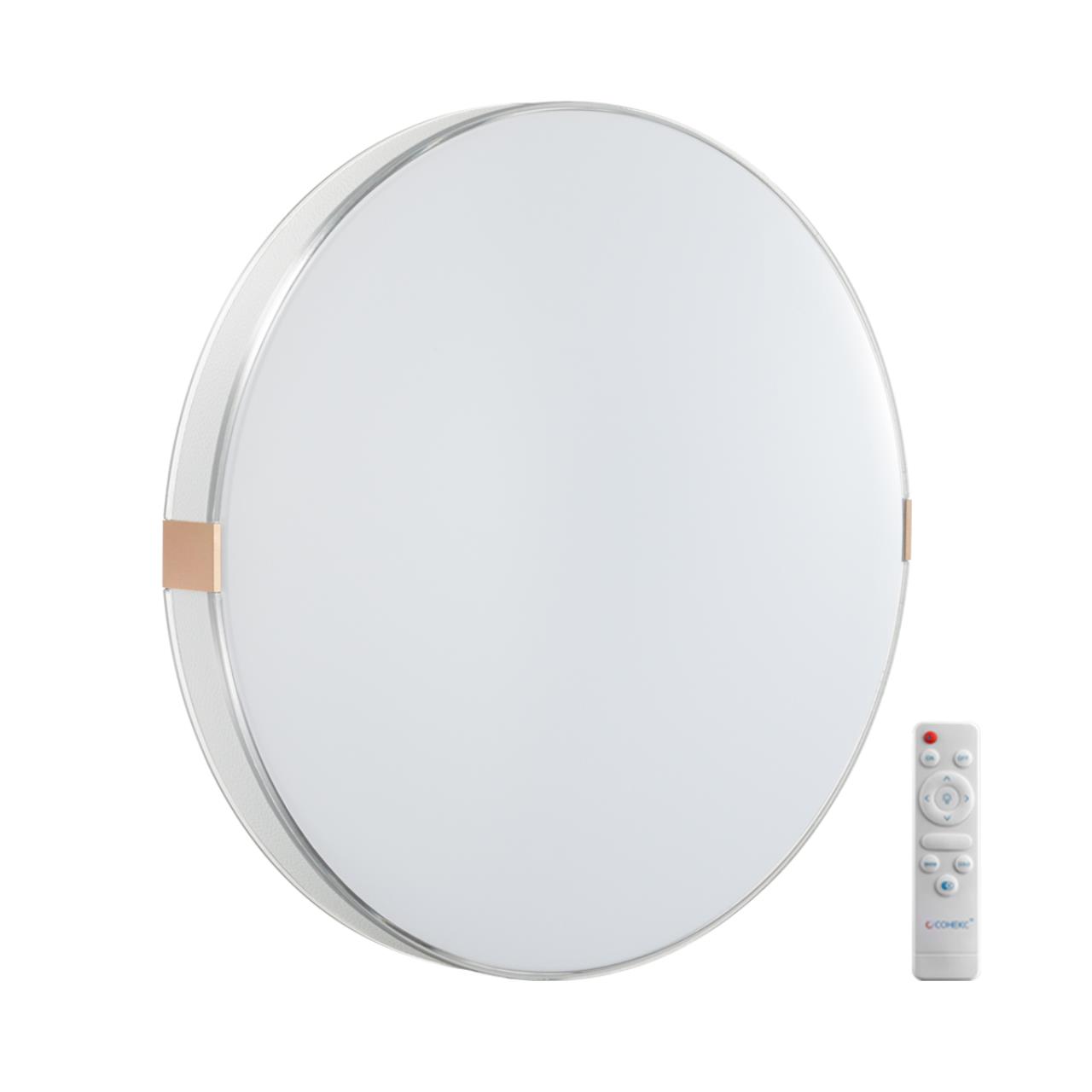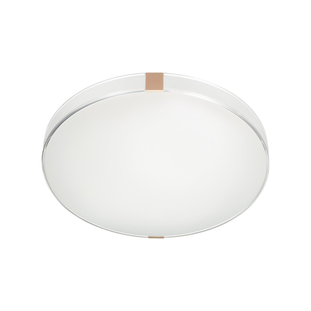 Светильник 7676/EL линии OTIGA WHITE состоит из металлического основания (базы) и пластикового рассеивателя. Материал рассеивателя - высококачественный пластик марки PMMA 2.0 белого цвета с матовой поверхностью, без текстуры. Пластик обеспечивает светильнику равномерное рассеивание и хорошее светопропускание. Форма плафона: круглая, с ободом из прозрачного пластика, декорированного эко кожей белого цвета. Обод украшен металлическими клипсами, цвет золото. Степень защиты IP43 позволяет использовать светильник в определенных зонах влажных помещений. В комплект входит заменяемый LED модуль с линзами, мощностью 70Вт, которая соответствует лампе накаливания 610Вт. А также пульт ДУ (с креплением на стену), с помощью которого осуществляется плавное изменение цветовой температуры 3000-6000К, изменение яркости, переход в режим переключения теплого/белого/холодного/ночного света. Светильник имеет функцию "память".
