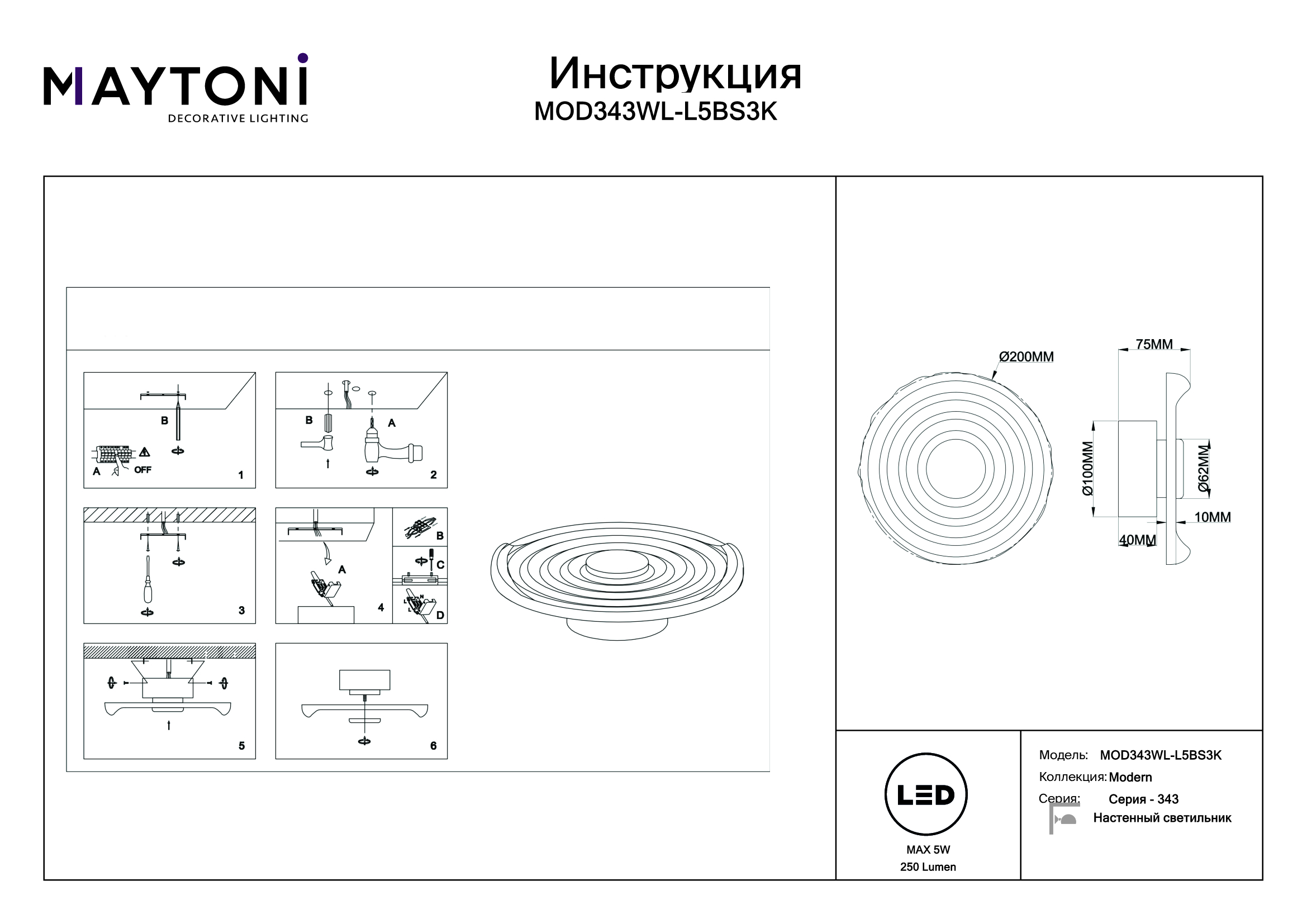 Данную модель MOD343WL-L5BS3K с быстрой доставкой спешите купить по цене 8 990 ₽ в магазине 220svet.ru