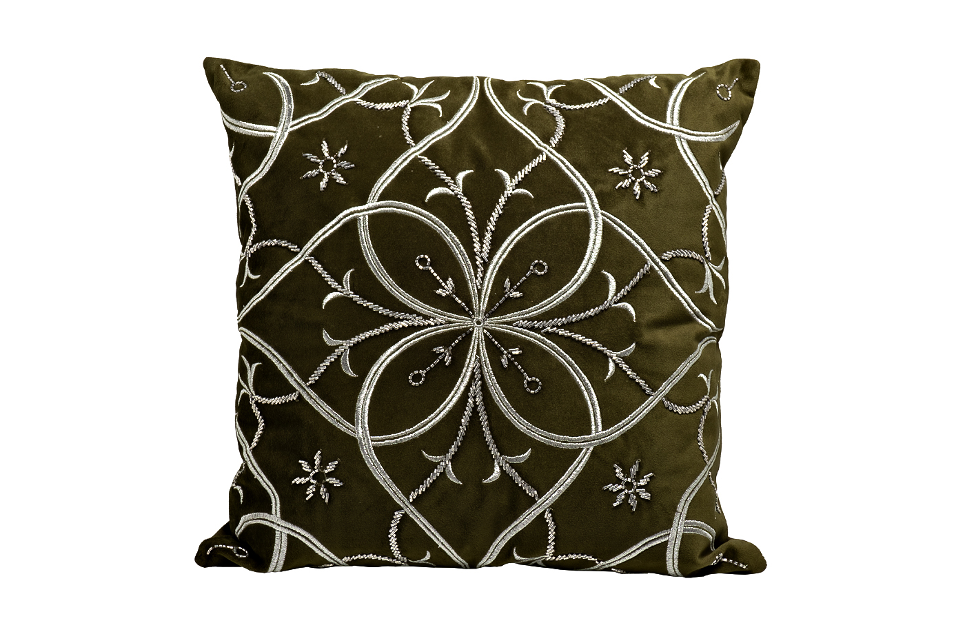 Для тех, кто ценит классические симметричные орнаменты, отлично подойдет эта декоративная подушка на кровать в спальню или в качестве украшения дивана. На зеленом фоне изображен серебристый узор, напоминающий мандалы, – способствует снятию напряжения после рабочего дня, настраивает на приятный отдых, расслабление, созерцание. Классическая квадратная декоративная подушка зеленого цвета –«изюминка» современного интерьера.