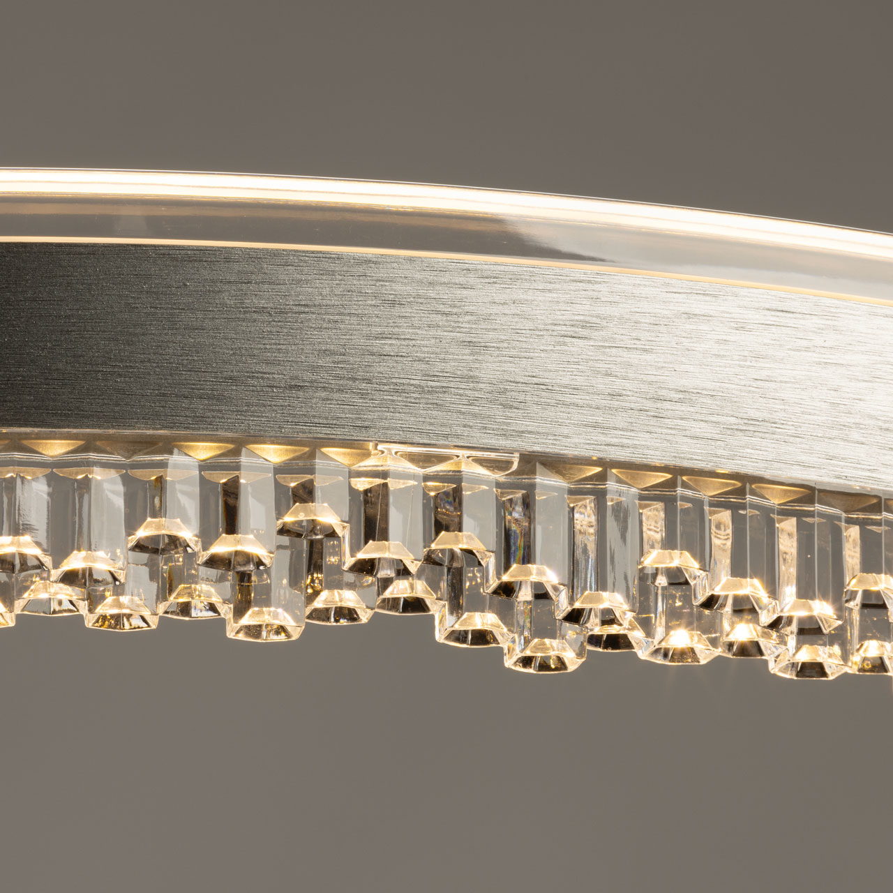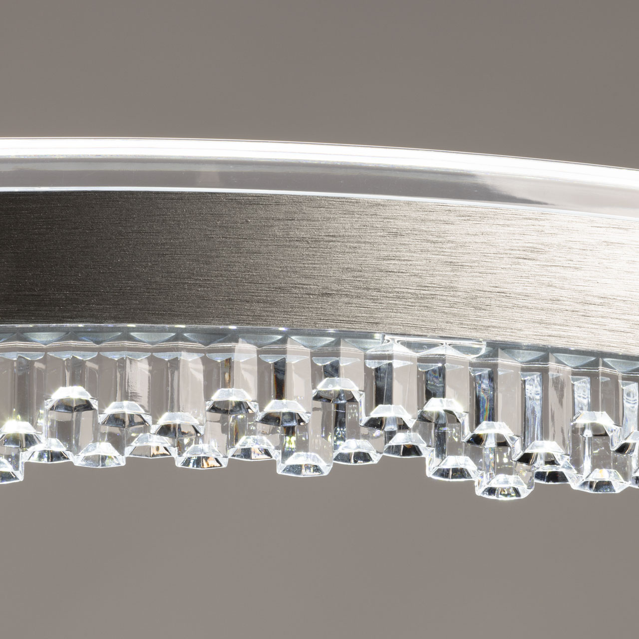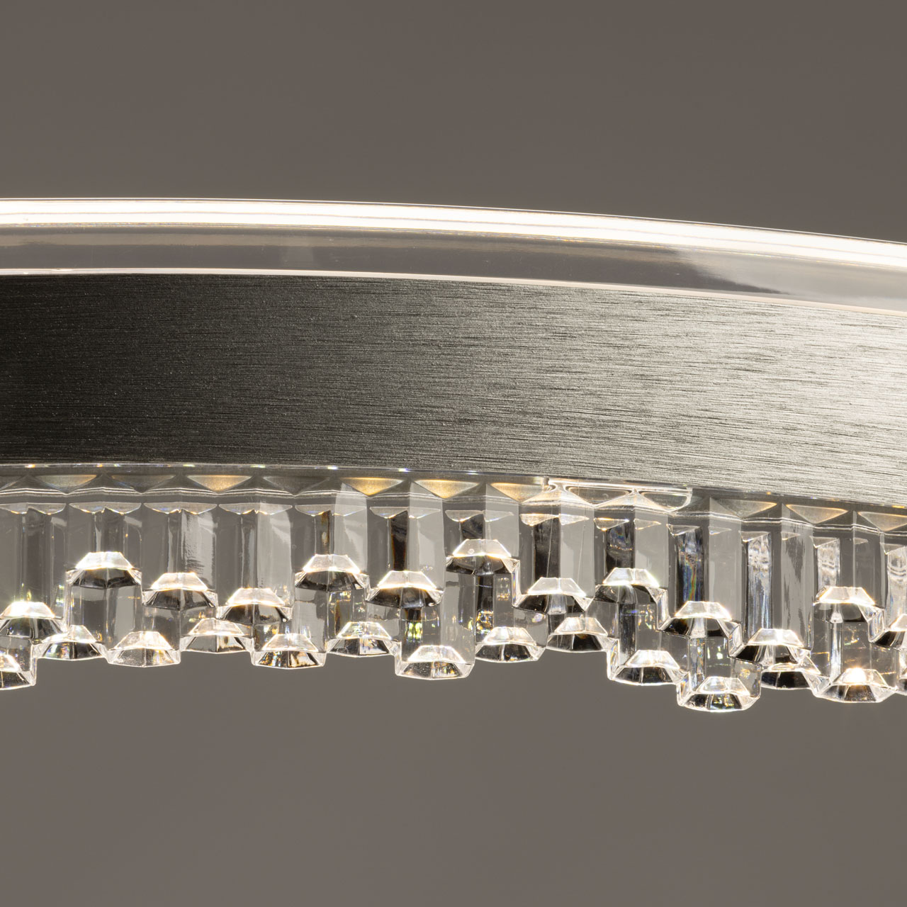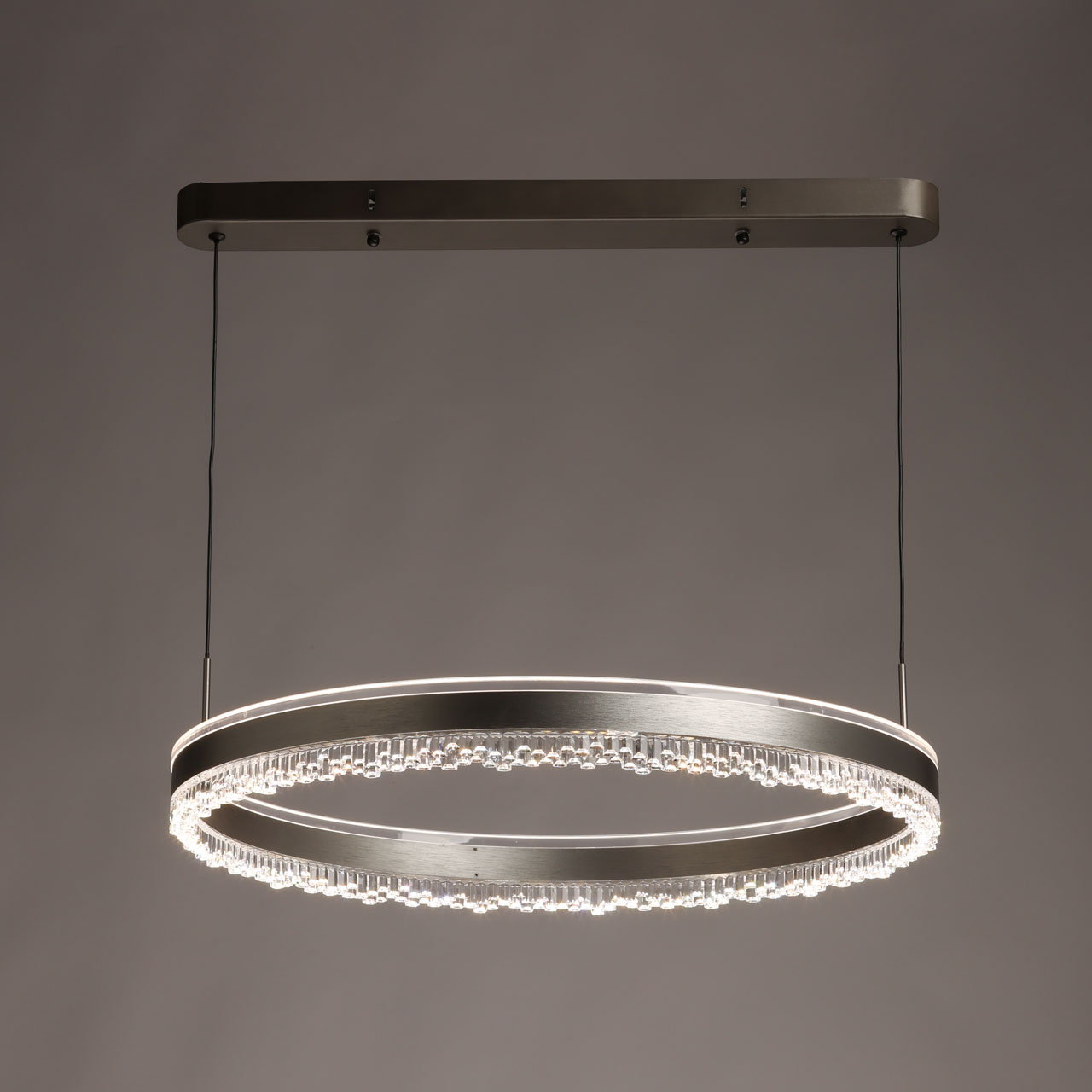 Металлическое основание подвесной люстры окрашено в черный цвет. Плафон люстры выполнен из сплава алюминия с цинком и гальванизирован в цвет графита. Светодиодный источник света закрыт прозрачным акрилом.