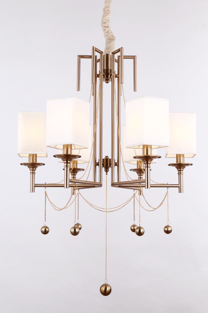Модель оснащена 6 лампами, что позволяет осветить помещение площадью от 15 до 20 квадратных метров. Это даст возможность наполнить пространство мягким и равномерным светом, создавая комфорт и уют. Арматура выполнена из качественного металла, а бежевые плафоны из ткани придают люстре изысканный вид. Высота люстры 1150 мм, диаметр 630 мм.