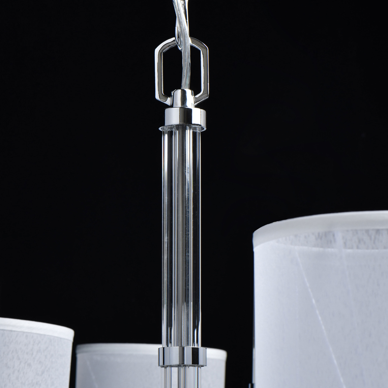 универсальная цветовая гамма, подходящая под любой интерьер: металлическое хромированное основание эстетично сочетается с белыми полупрозрачными абажурами из ткани, бережно рассеивающими свет;