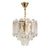 Металлическое основание подвесной люстры гальванизировано в цвет латуни. Люстра декорирована хрустальными прозрачными фактурными пластинами сложной огранки.
