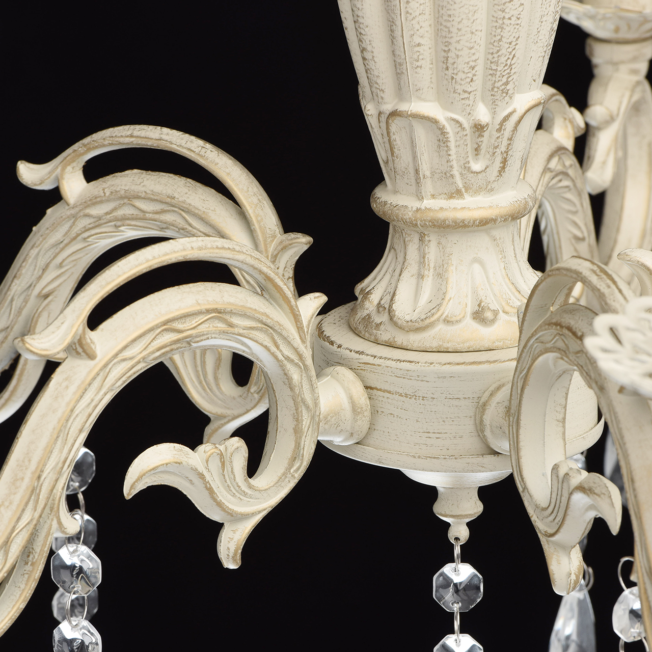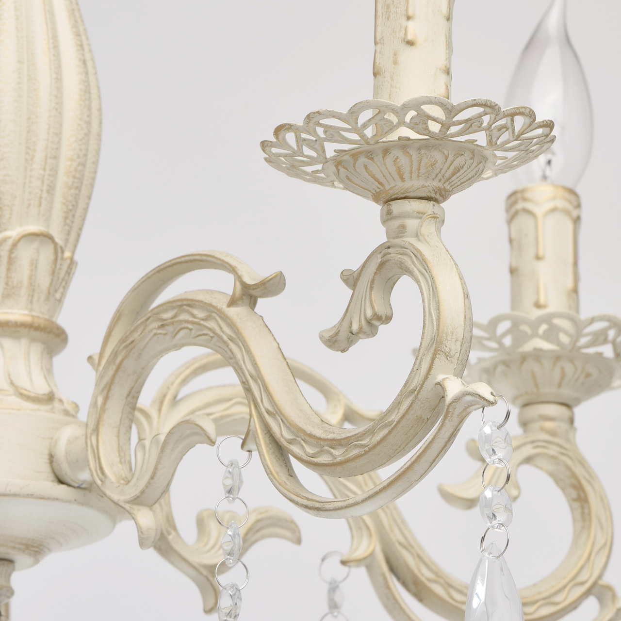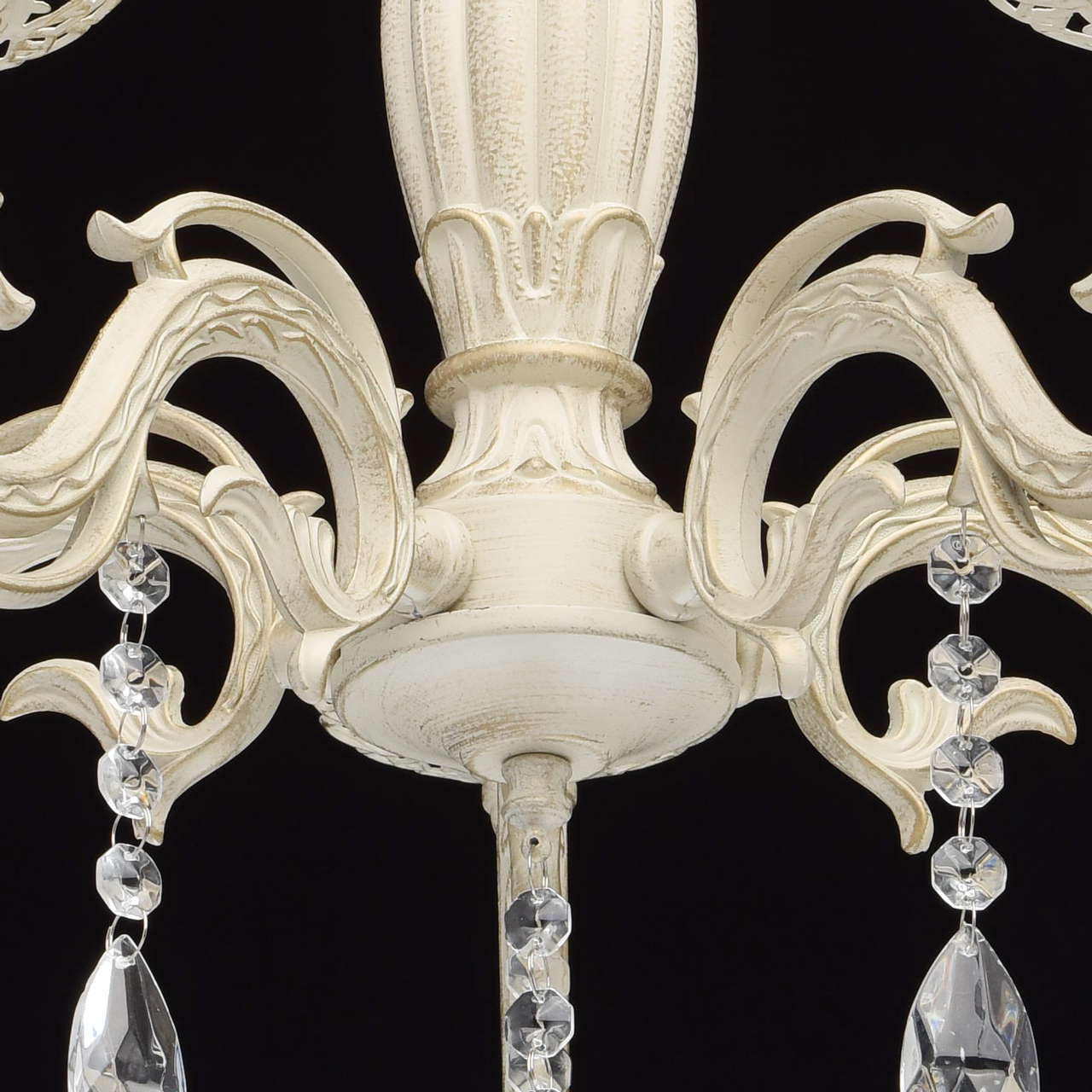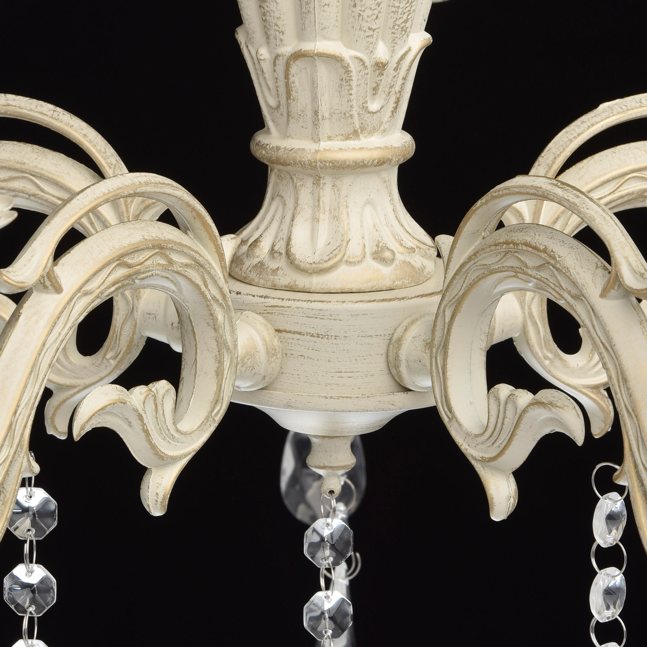 Основание светильника выполнена из комбинации сплавов металлов и окрашена по технологии хай-лайт, основный слой - белый, декоративный слой - золотого цвета. Потолочная чаша светильника, корпус, декоративные розетки, надпатронники выполнены из металла по технологии прессования. Центральный стержень и рожки выполнены из сплава алюминия по технологии художественного литья.Декор: подвески из декоративного стекла.