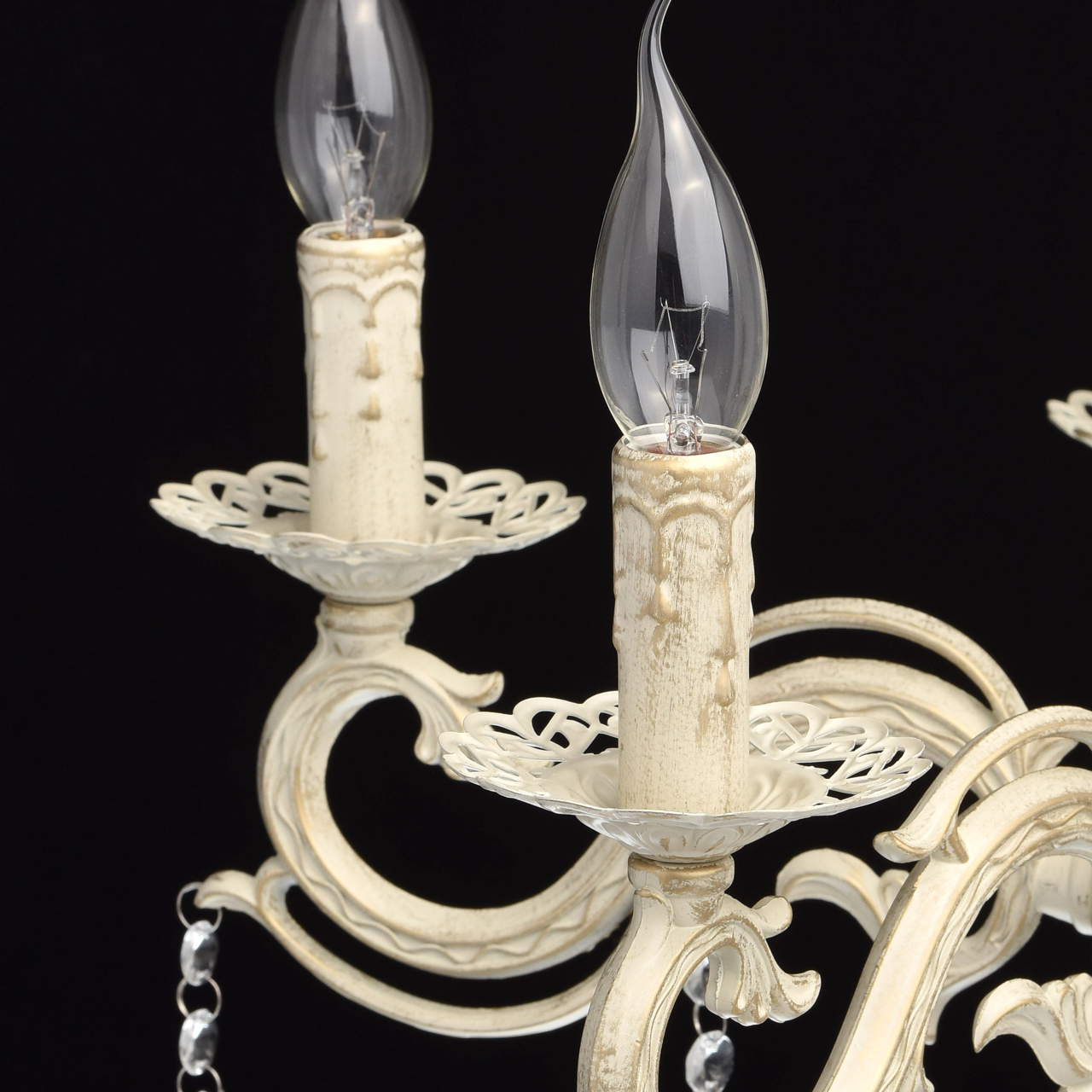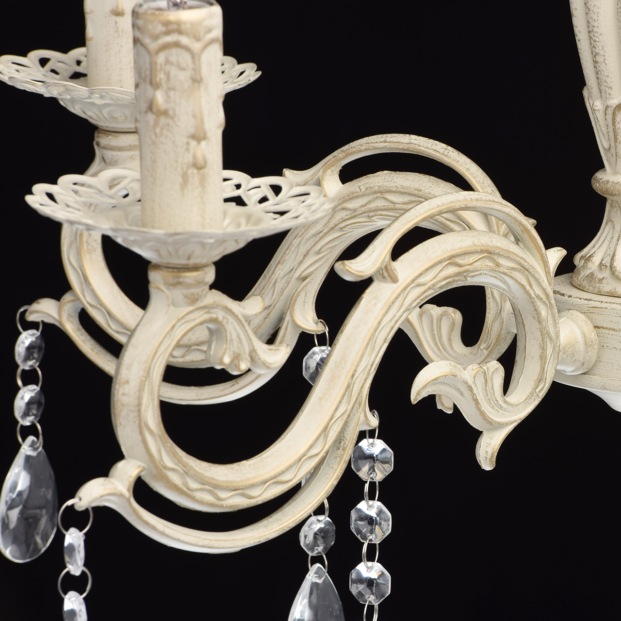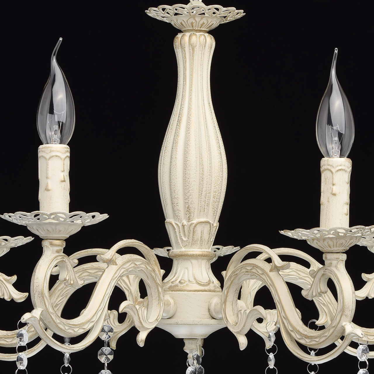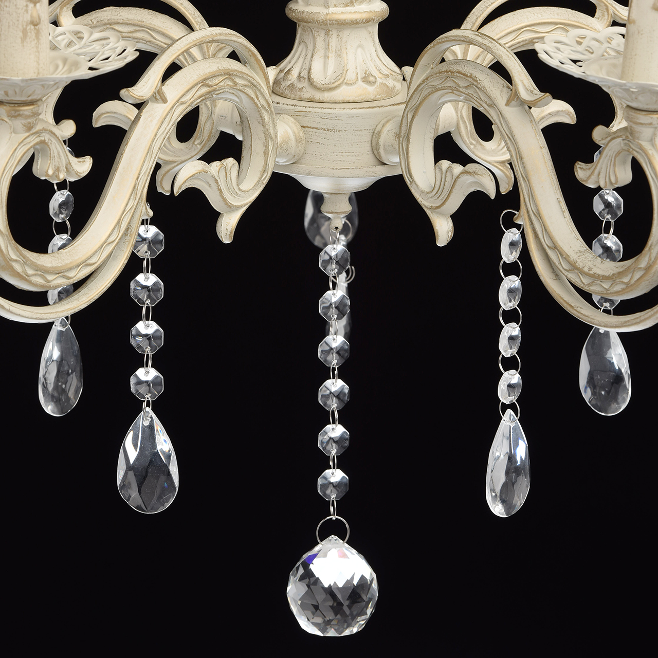 Основание светильника выполнена из комбинации сплавов металлов и окрашена по технологии хай-лайт, основный слой - белый, декоративный слой - золотого цвета. Потолочная чаша светильника, корпус, декоративные розетки, надпатронники выполнены из металла по технологии прессования. Центральный стержень и рожки выполнены из сплава алюминия по технологии художественного литья.Декор: подвески из декоративного стекла.