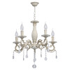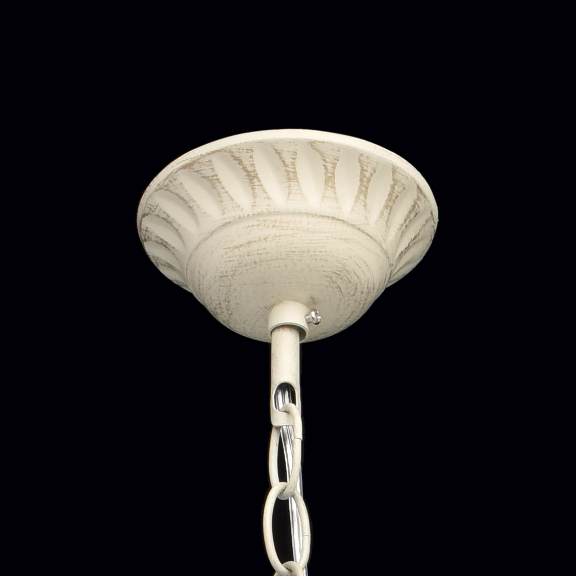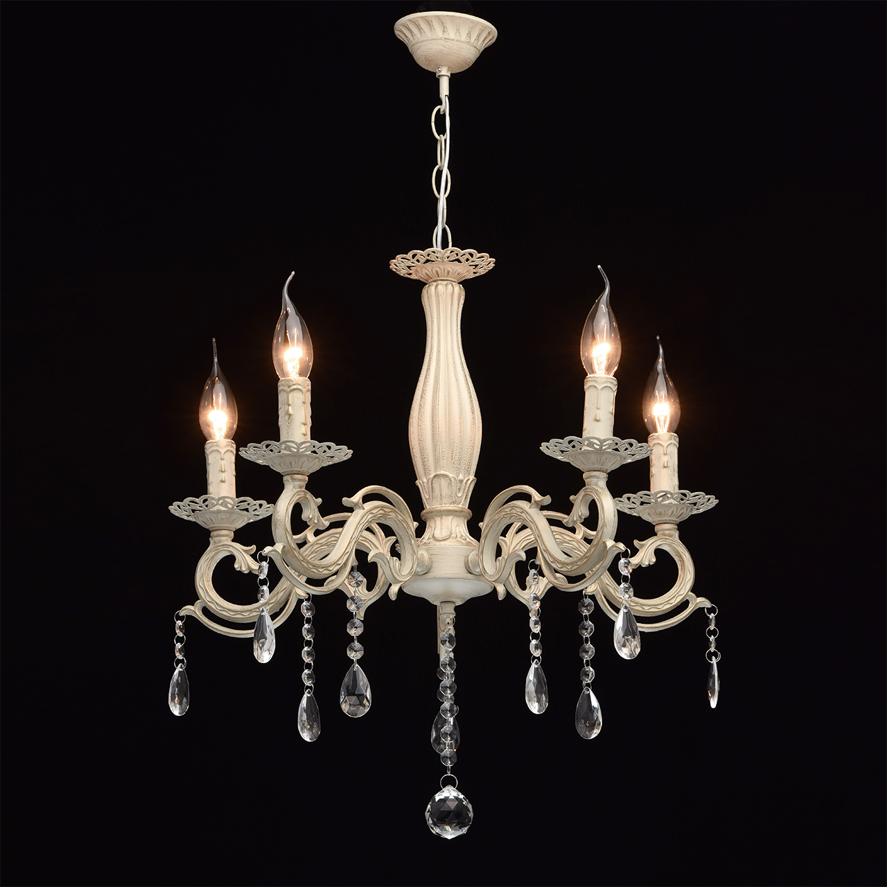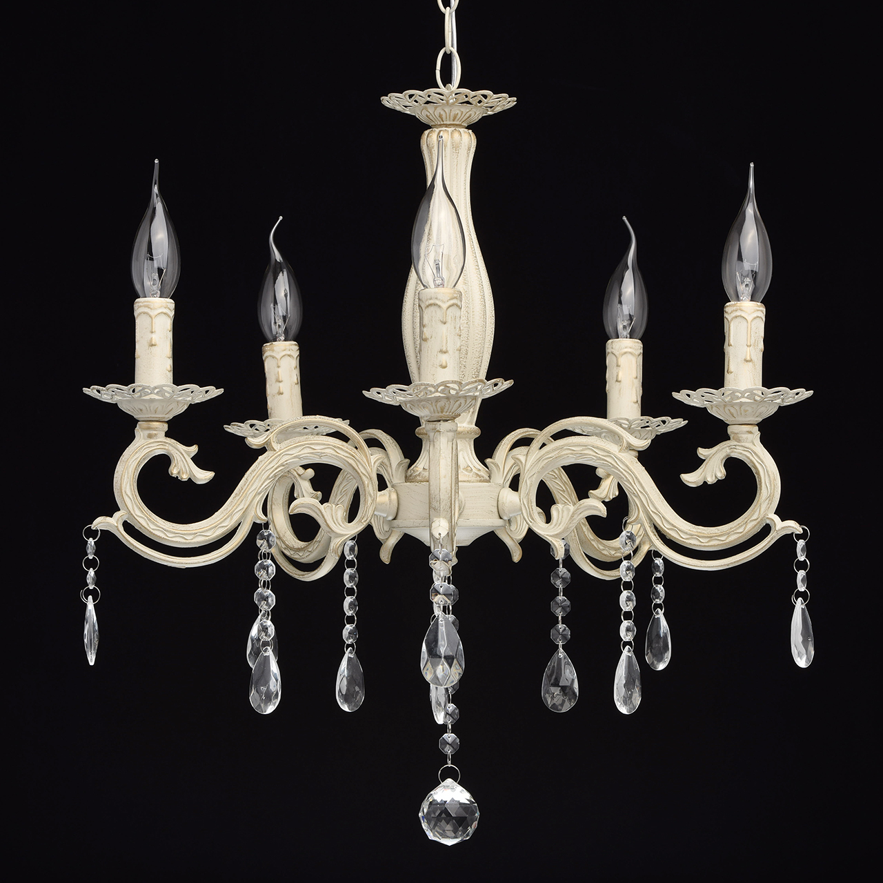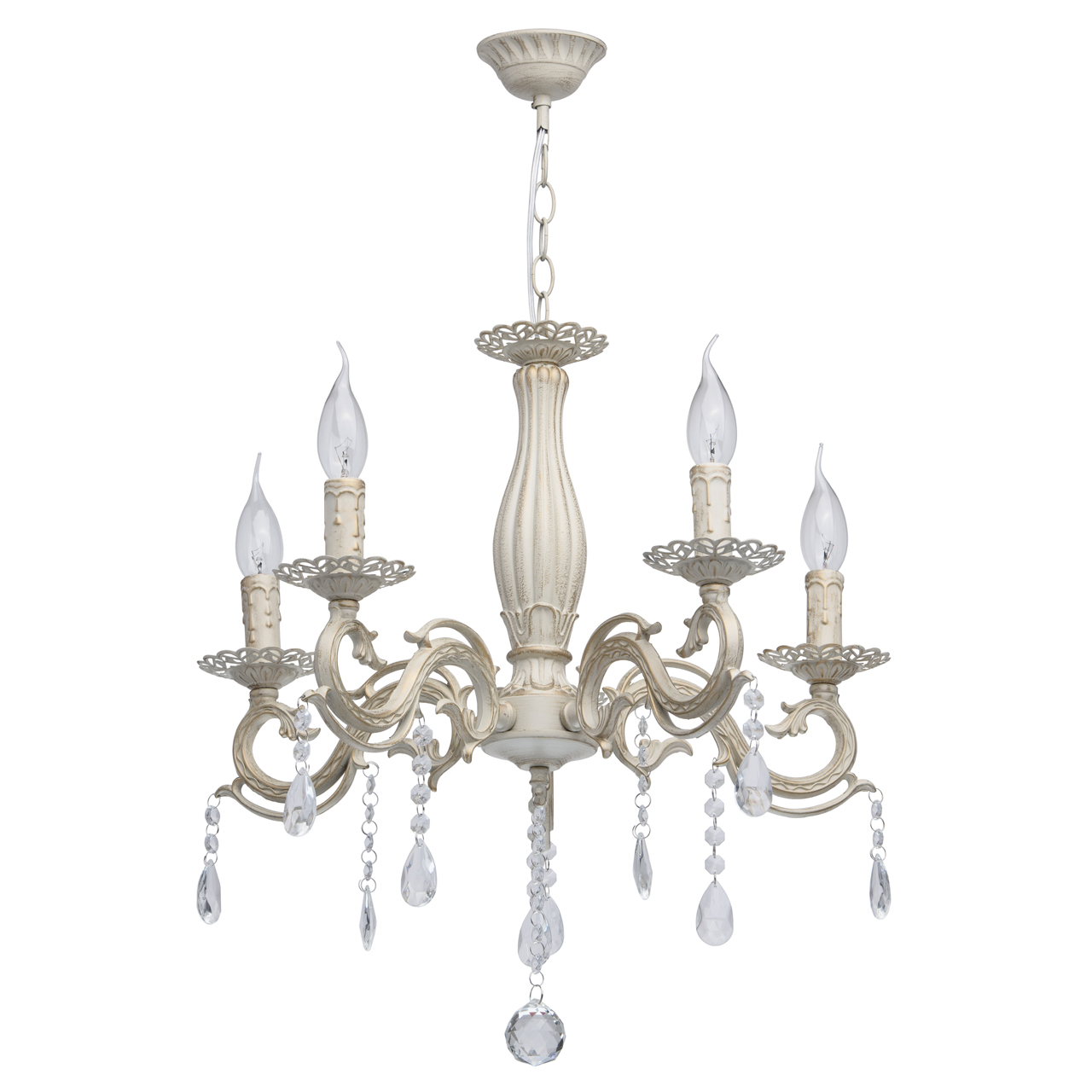 Основание светильника выполнена из комбинации сплавов металлов и окрашена по технологии хай-лайт, основный слой - белый, декоративный слой - золотого цвета. Потолочная чаша светильника, корпус, декоративные розетки, надпатронники выполнены из металла по технологии прессования. Центральный стержень и рожки выполнены из сплава алюминия по технологии художественного литья.Декор: подвески из декоративного стекла.