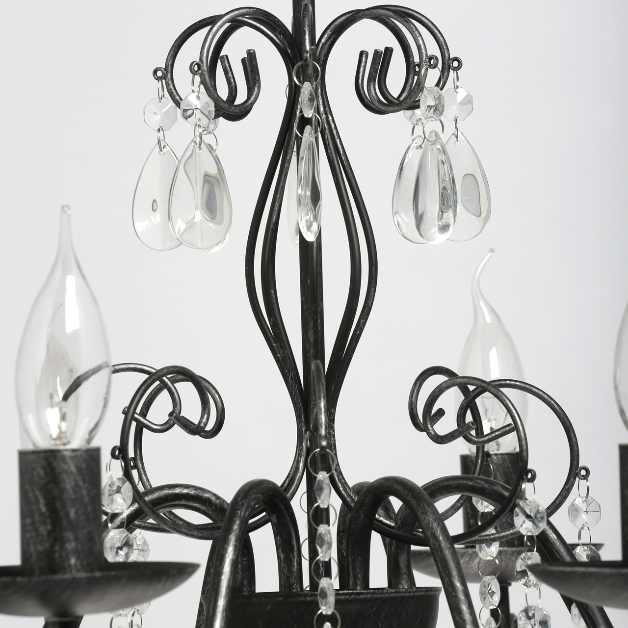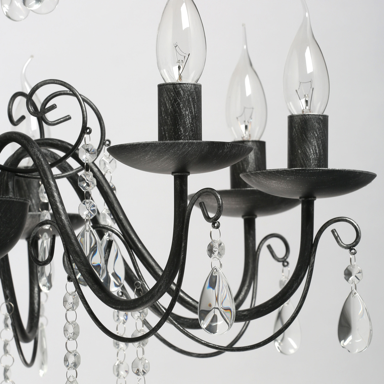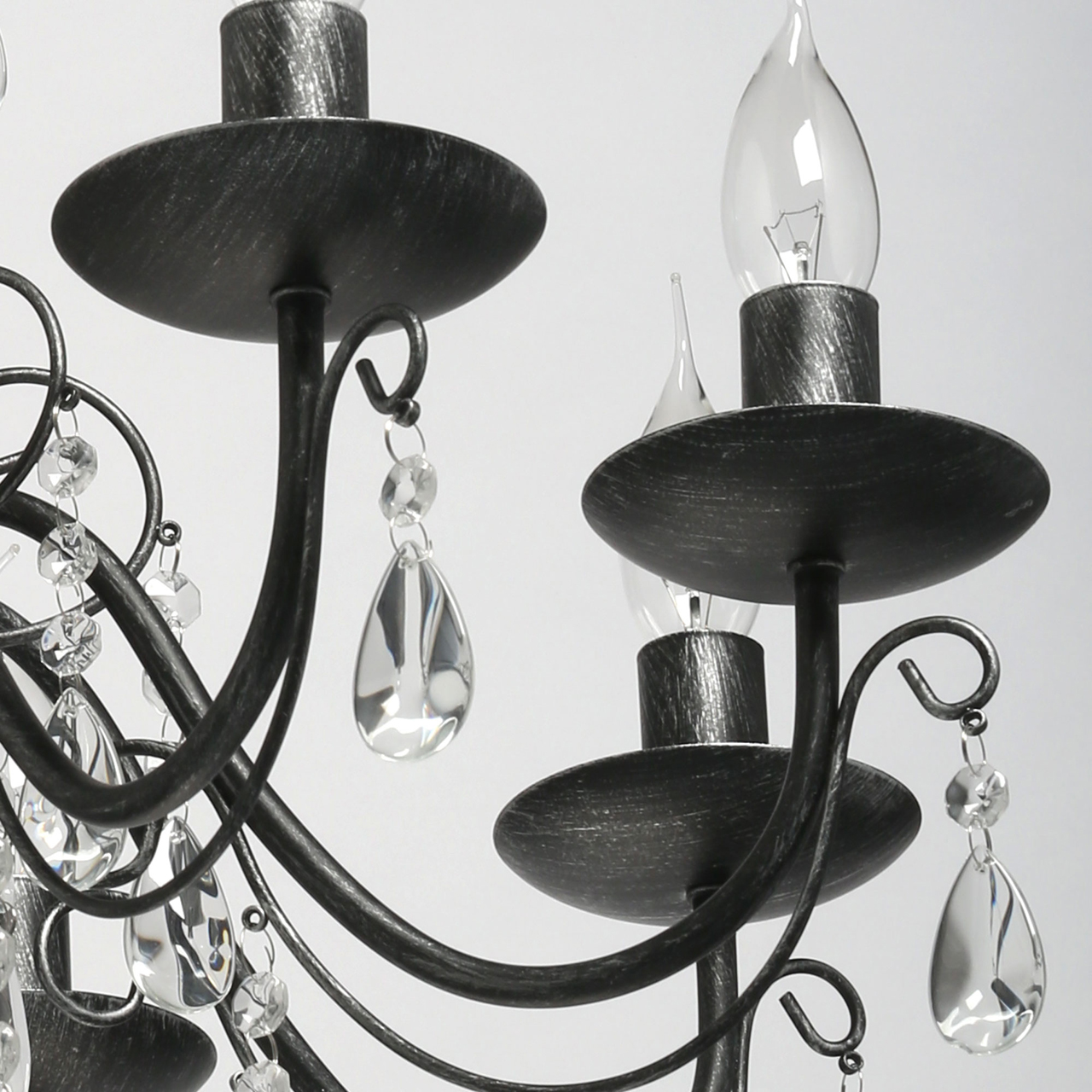 Основание светильника выполнено из металла и обработано по технологии хай-лайт, где основной слой черного цвета, а декоративный слой серебряного цвета. Светильник декорирован прозрачным хрусталем.
