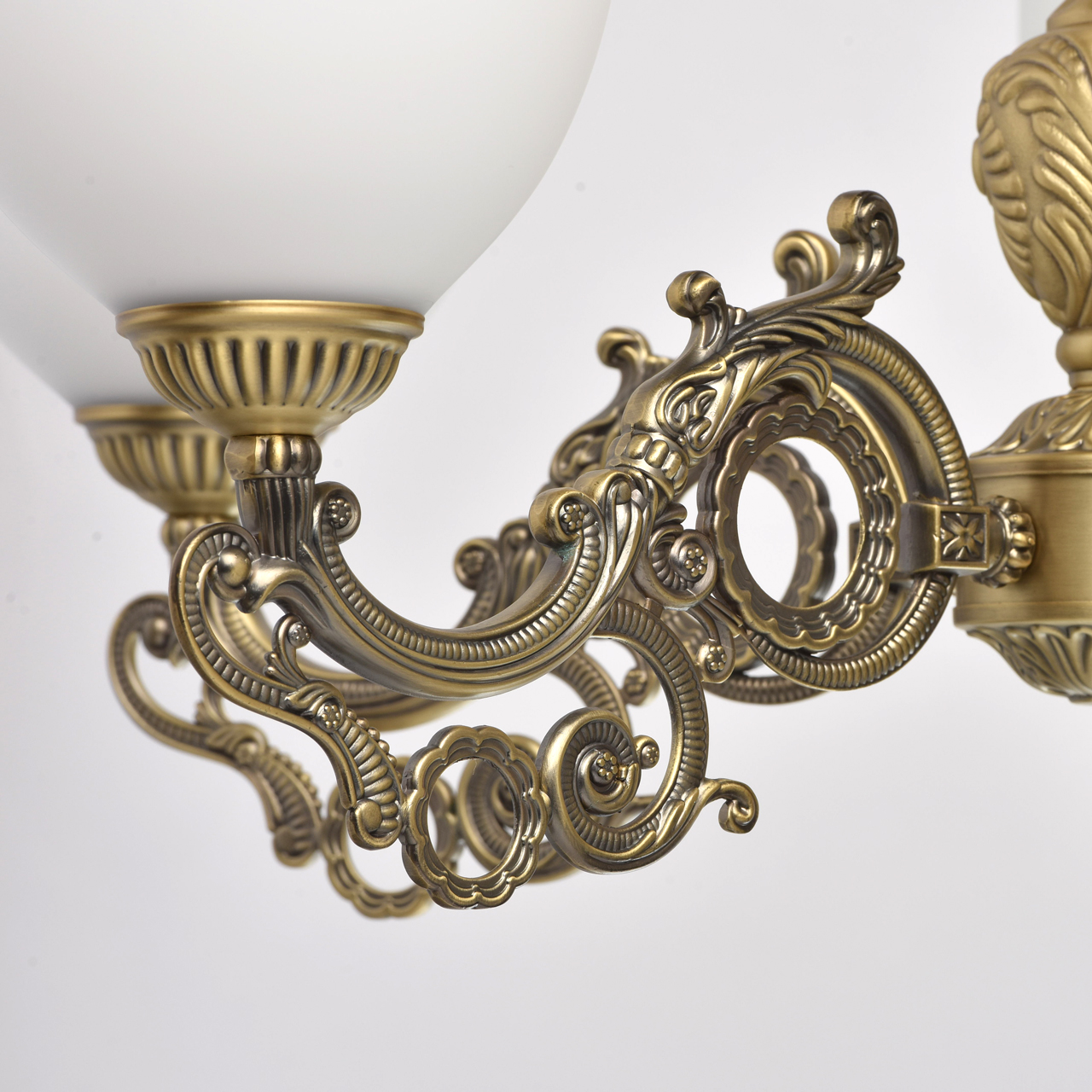 Основание: комбинация сплавов металлов, гальванизировано в цвет античной бронзы, патинирована и лакирована.Потолочная чаша: металл, обработка на токарном станке.Корпус, декоративные розетки: металл, прессование.Центральный стержень, рожки, декоративная гайка: сплав алюминия, художественное литье.Плафоны: отлиты в форму, матированы.