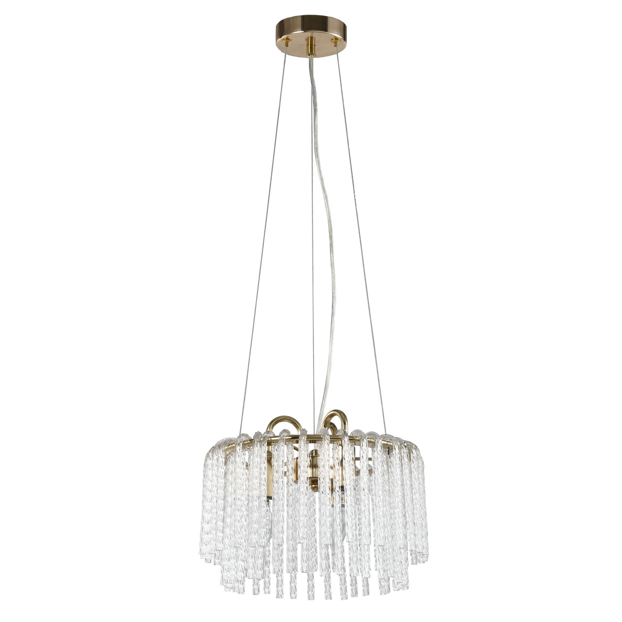 Металлическое основание подвесной люстры гальванизировано в цвет золота. Светильник декорирован прозрачными стеклянными извитыми элементами. Актуальный цвет основания благородного золота.