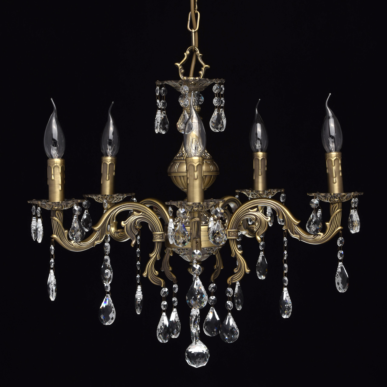Центральная часть люстры изготовлена из сплава металлов и окрашена в оттенок бронзы с патинированием. 5 изогнутых вверх рожков выполнены с огромным вниманием к деталям. Множество резных фрагментов, оригинальные розетки и напатронники, имитирующие расплавленный воск – все это создает достоверное впечатление старинного канделябра. Усиливает его отсутствие плафонов, роль источников света и пламени выполняют лампы накаливания. Венчают благородную композицию подвесы из хрусталя «a-grade», гроздями спускающиеся с розеток.