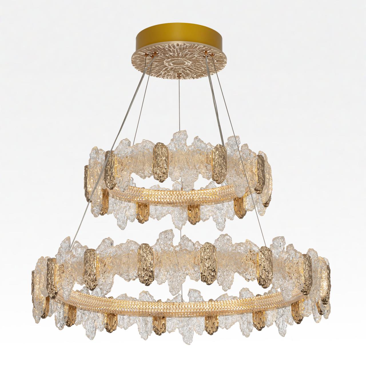 Каркас люстры — металлический, роскошного золотистого оттенка. Два подвесных кольца закреплены на тонких тросах и будто парят в воздухе. Рассеиватель из оптического полимера имеет оригинальную форму, напоминающую потоки застывшей лавы. Люстра подойдет к любому типу потолка, включая натяжные конструкции, высоту подвеса можно легко изменить.