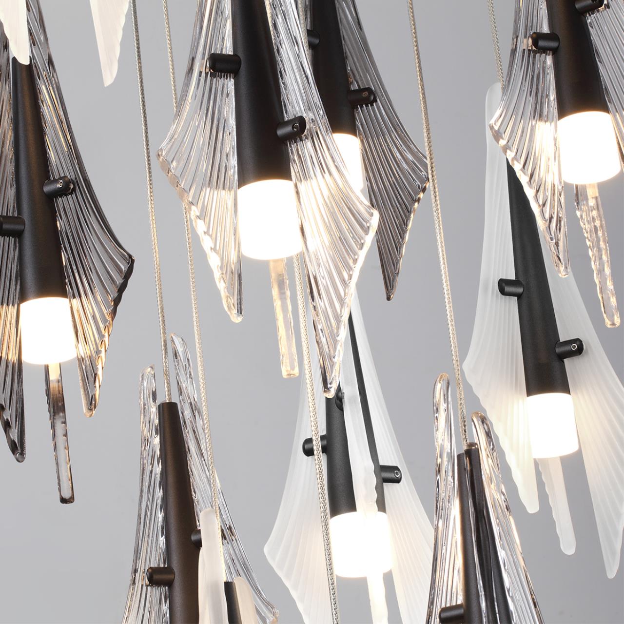Afalina - невероятно дружелюбный дельфин из семейства афалин, обитающий в чёрном море. Именно они стали источником вдохновения при создании эскизов этих минималистичных и лаконичных светильников. Декоративные стеклянные рассеиватели исполнены в трех вариантах цвета - дымчатом, прозрачном и белом матовом. Каждый стеклянный элемент выполняется вручную по эскизам автора. Композиция из стеклянного декора напоминает стаю дельфинов афалин в сверкающей глади воды.