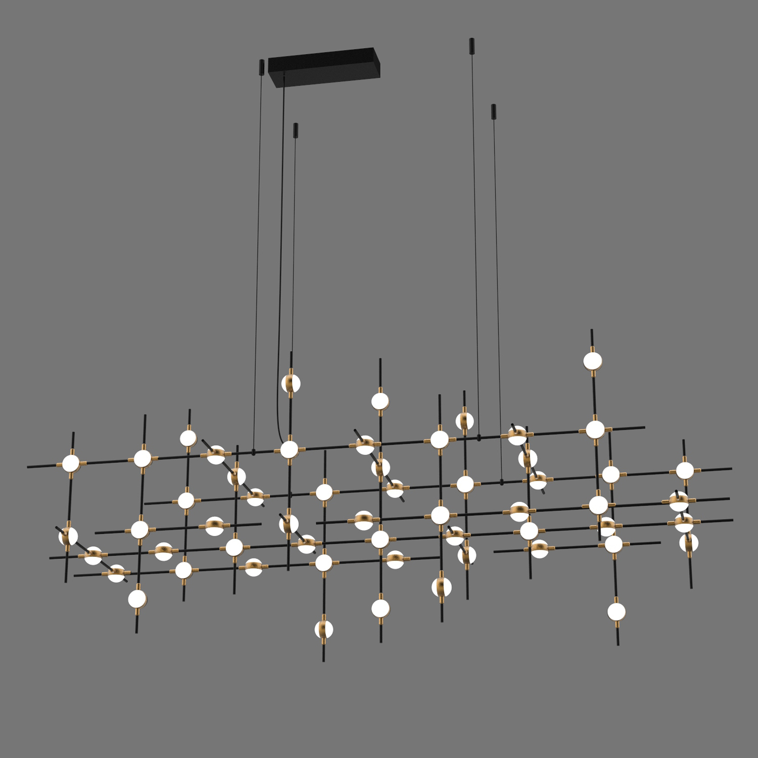 Большой подвесной светильник с каркасом из металла черного цвета и деталями золотого цвета. На пересечениях прутьев располагаются источники света. Общая мощность светильника LED 124.8W 3000K.