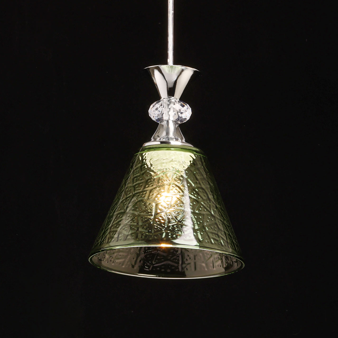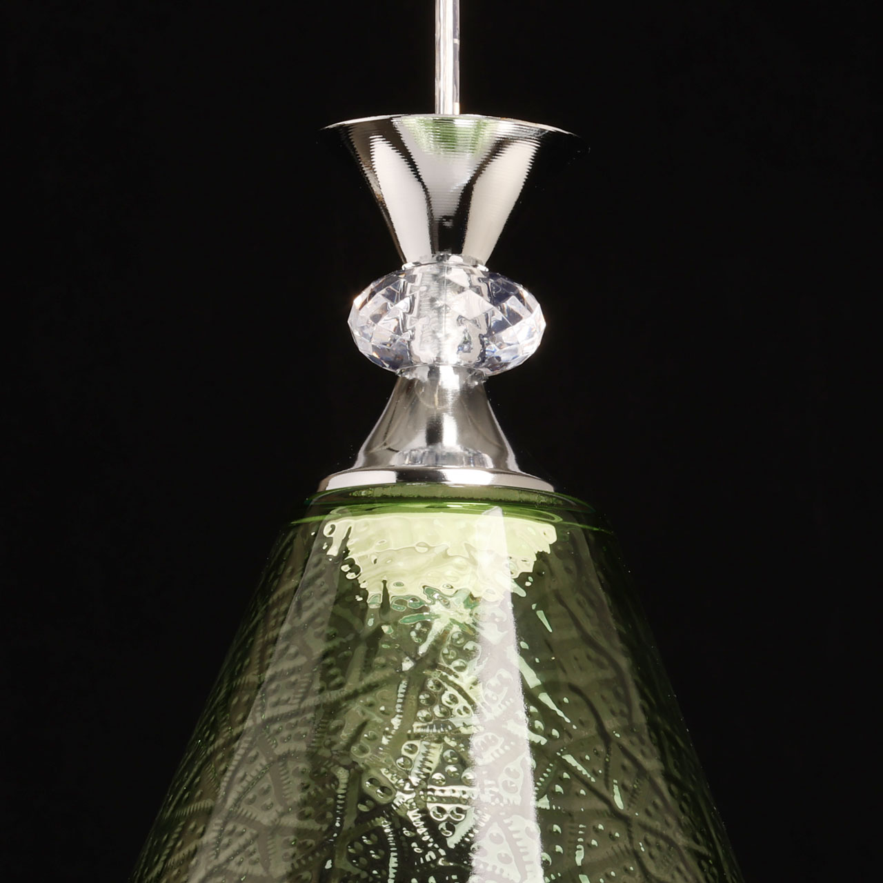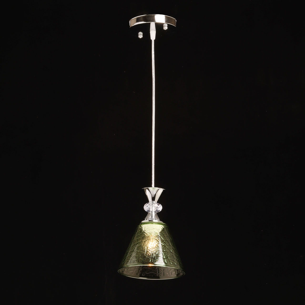 Металлическое основание окрашено в черный цвет. Традиционный источник света закрыт стеклянным плафоном с оригинальной фактурой, окрашенным в массе в зеленый цвет. Подвес декорирован прозрачным акрилом.
