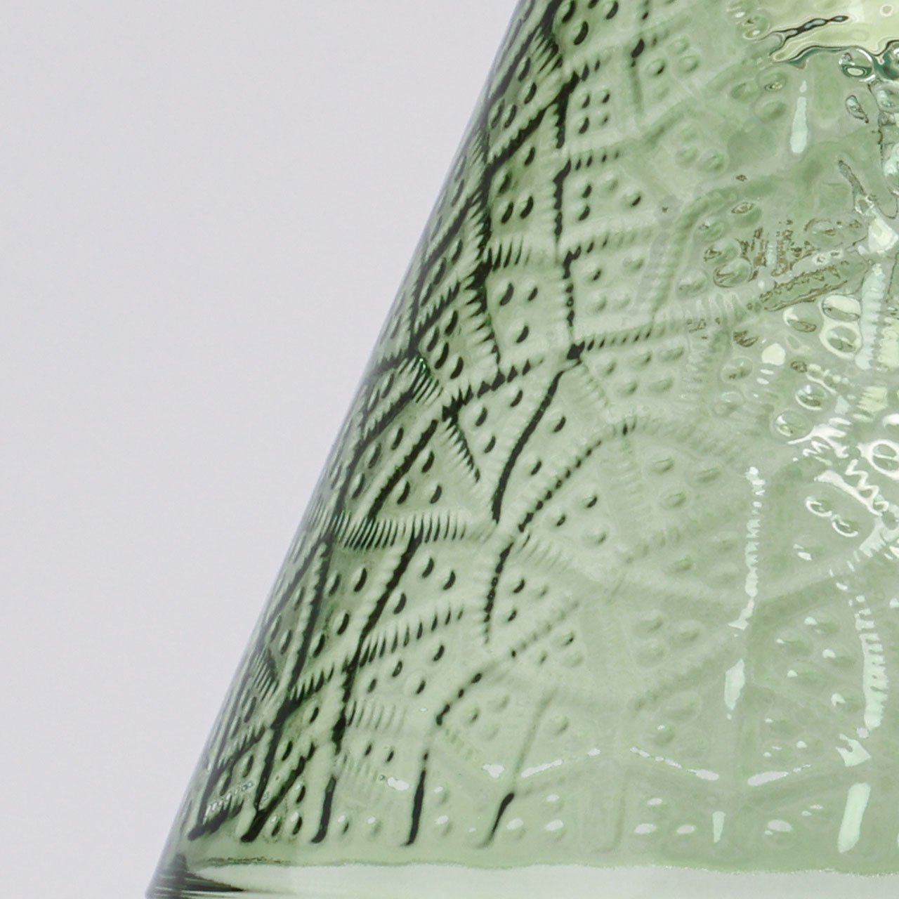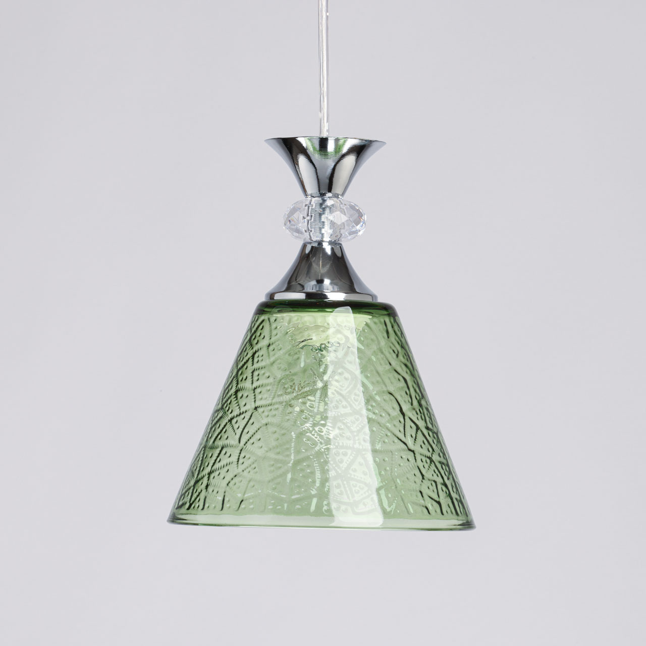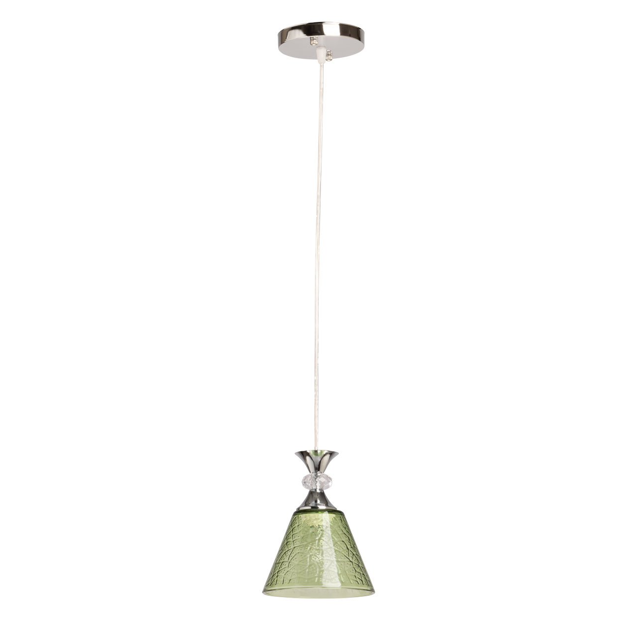 Металлическое основание окрашено в черный цвет. Традиционный источник света закрыт стеклянным плафоном с оригинальной фактурой, окрашенным в массе в зеленый цвет. Подвес декорирован прозрачным акрилом.