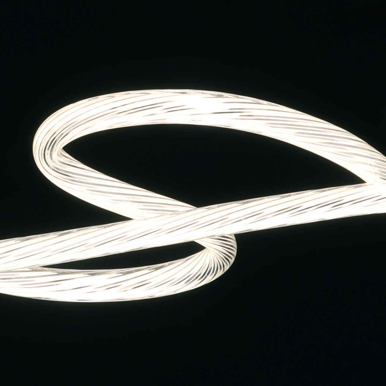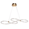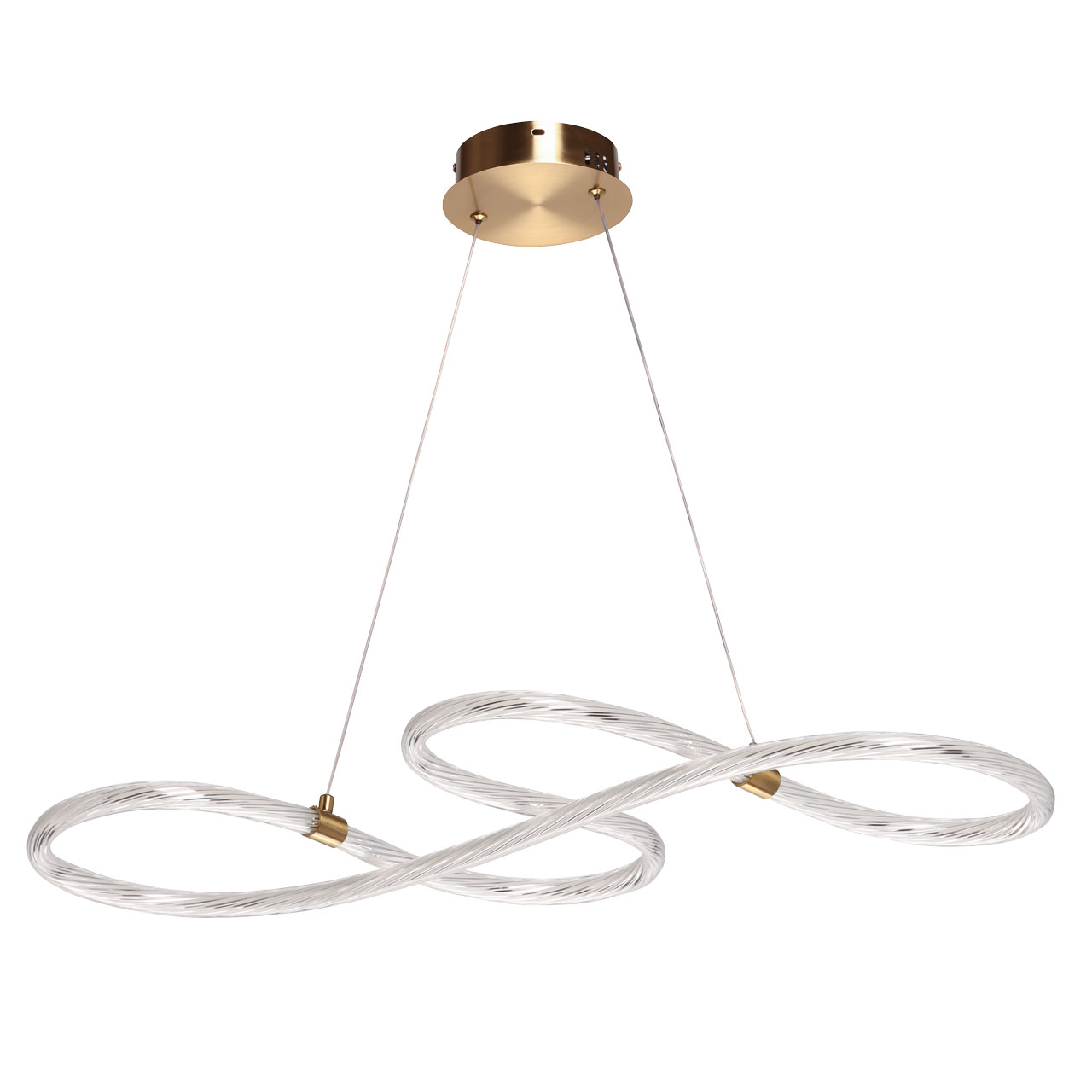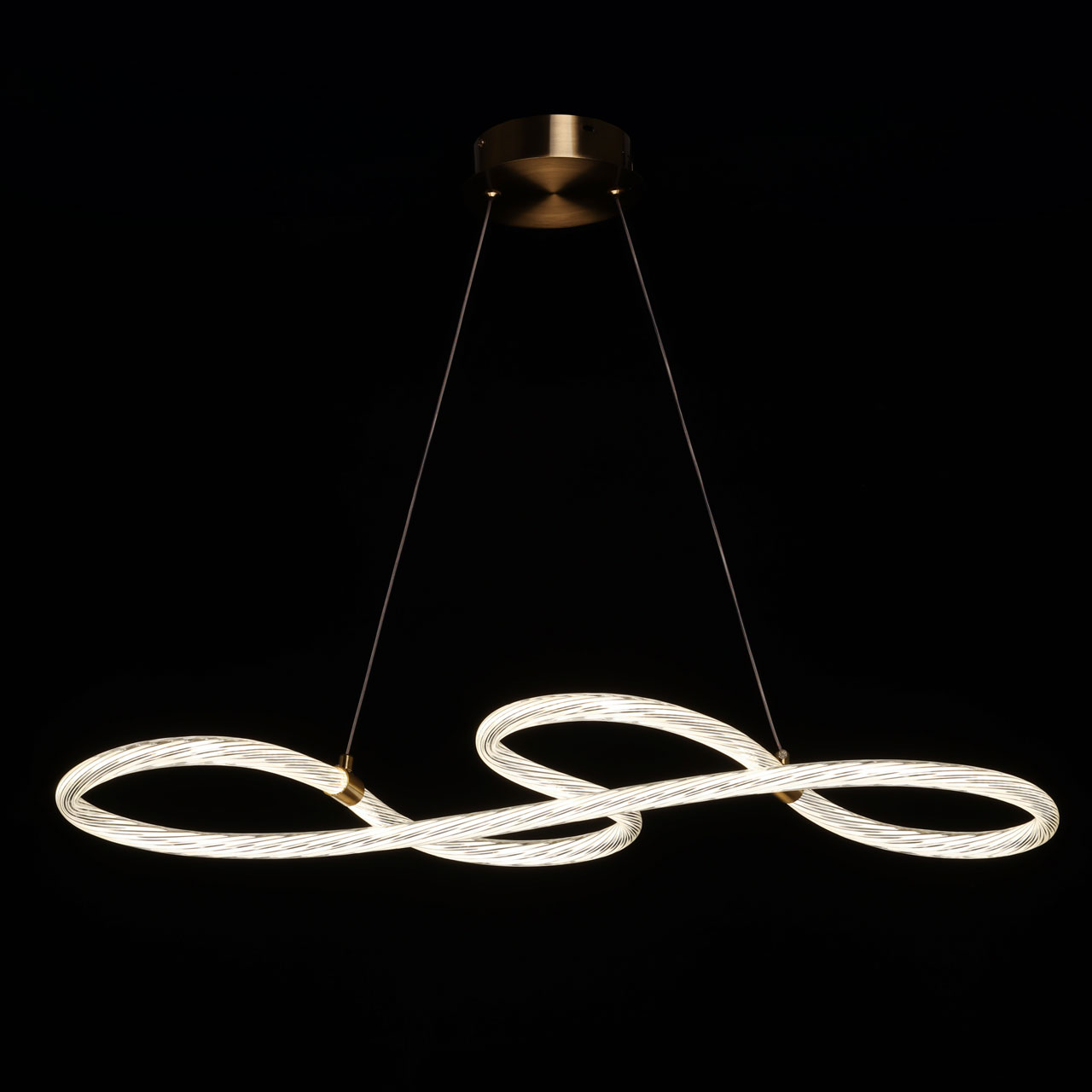 Металлическое основание подвесной люстры гальванизировано в цвет бронзы. Светодиодный источник света закрыт оригинальным плафоном изогнутой формы, выполненным из прозрачного литьевого акрила.