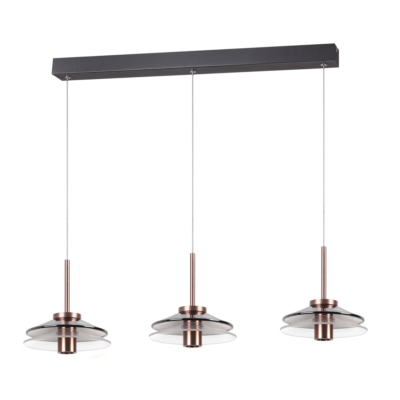 Минималистичный дизайн соответствует современным трендам. Модное сочетание контрастного черного и цвета меди. Стильно оформленный плафон, комбинированный стеклом дымчатого цвета и прозрачным акрилом, создает красивое освещение. Использование сплава алюминия в плафоне позволяет эффективно отводить тепло от светодиодов и продлевает время эксплуатации подвеса. Возможность устанавливать комфортную высоту. Светодиодные источники света безопасны и экономичны.