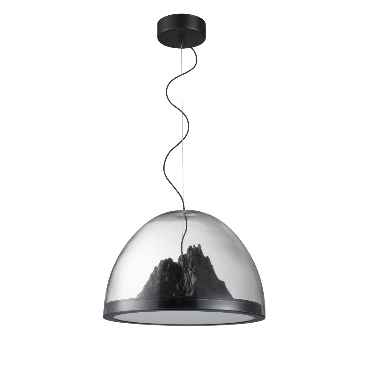 Подвесной светильник Delight Collection 8820P clear/black с куполообразным плафоном из прозрачного стекла. Внутри плафона декор из черного акрила, имитирующий горы. Металлические части черного цвета. Светильник имеет несколько режимов включения.