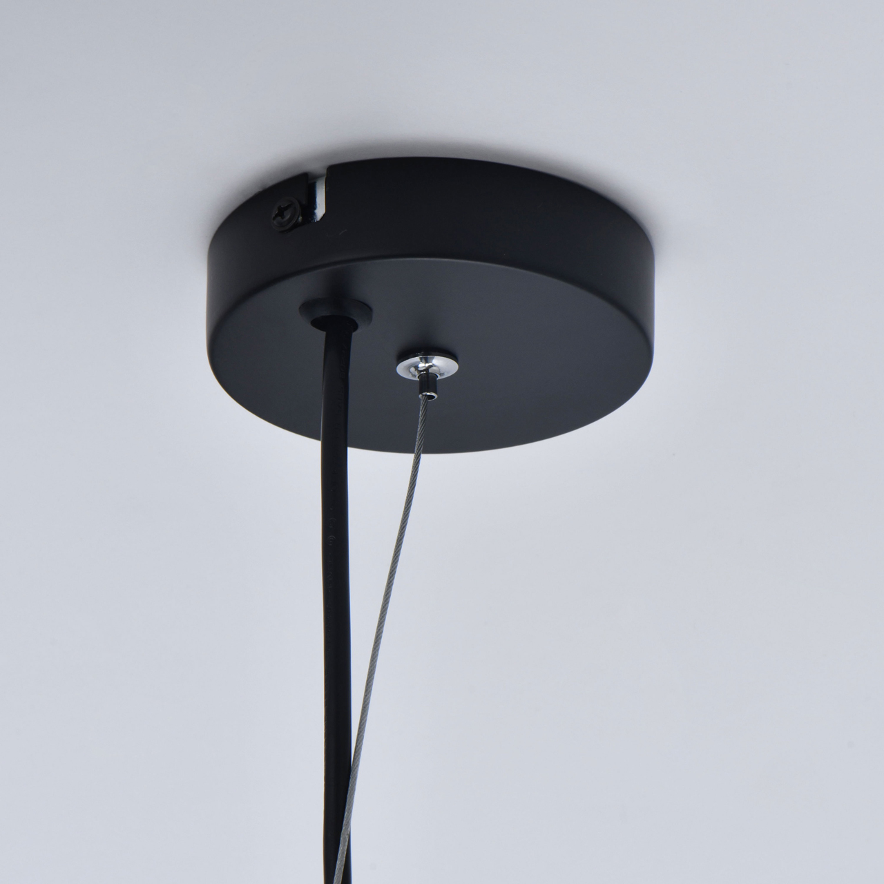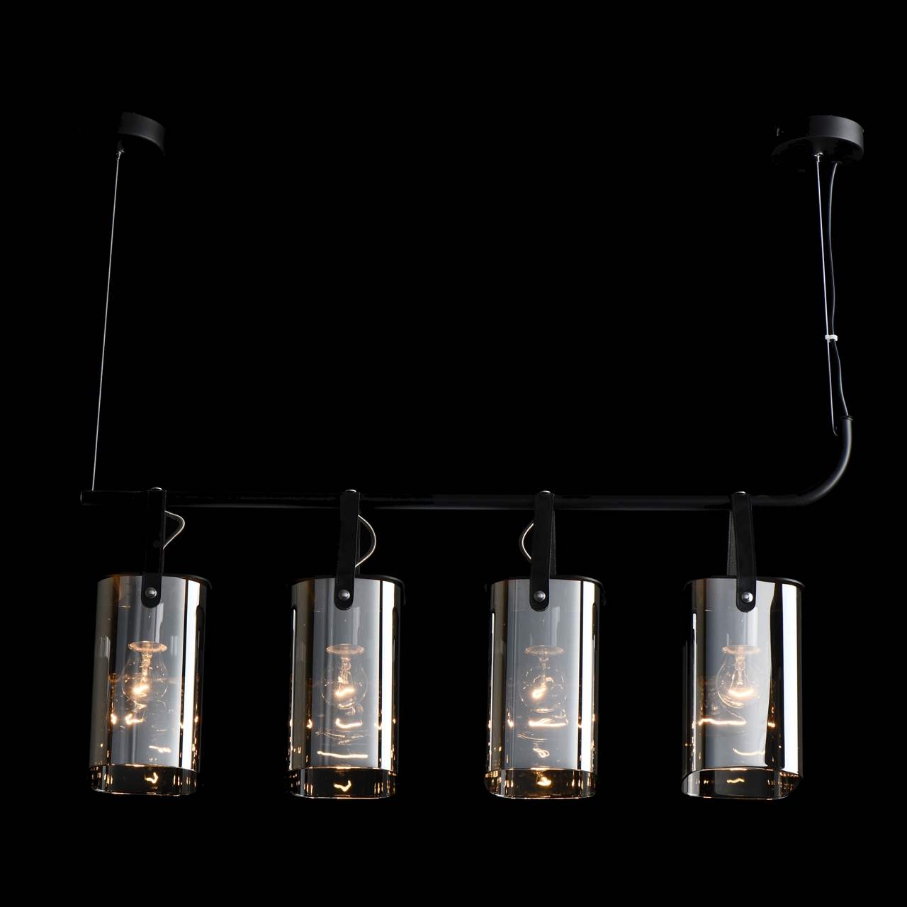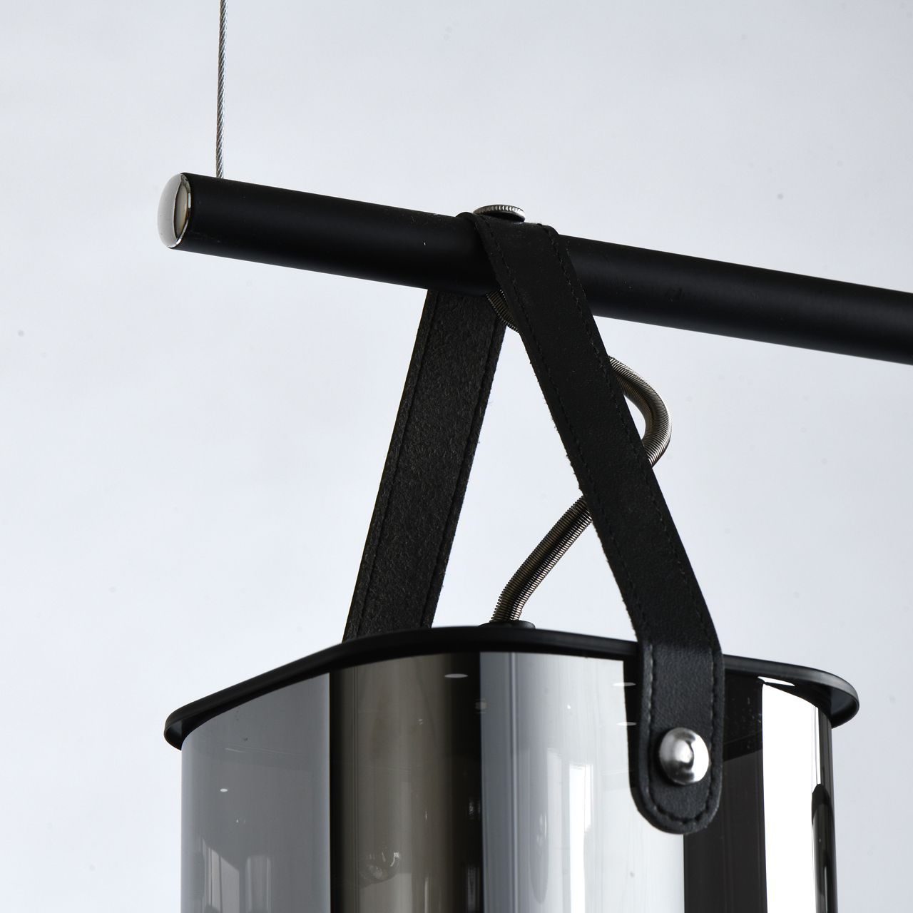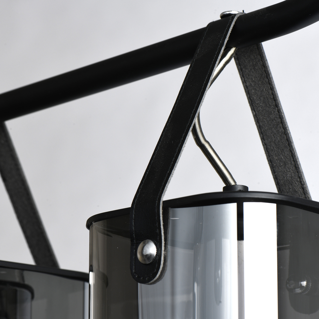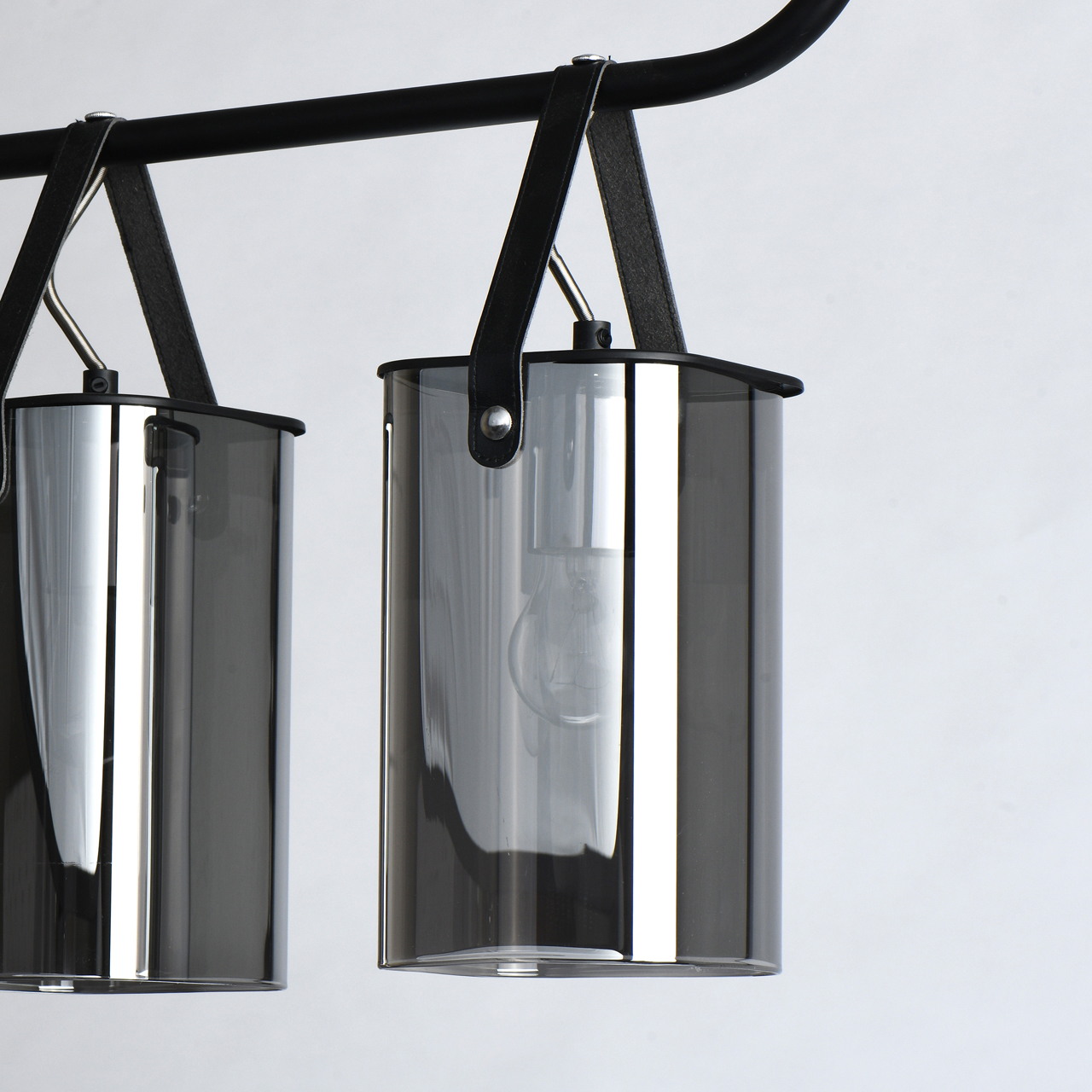 Основание светильника выполнено из металла и окрашено в черный цвет. Стеклянные плафоны гальванизированы в цвет антрацита. Плафоны крепятся к основанию на кожаных ремешках черного цвета.