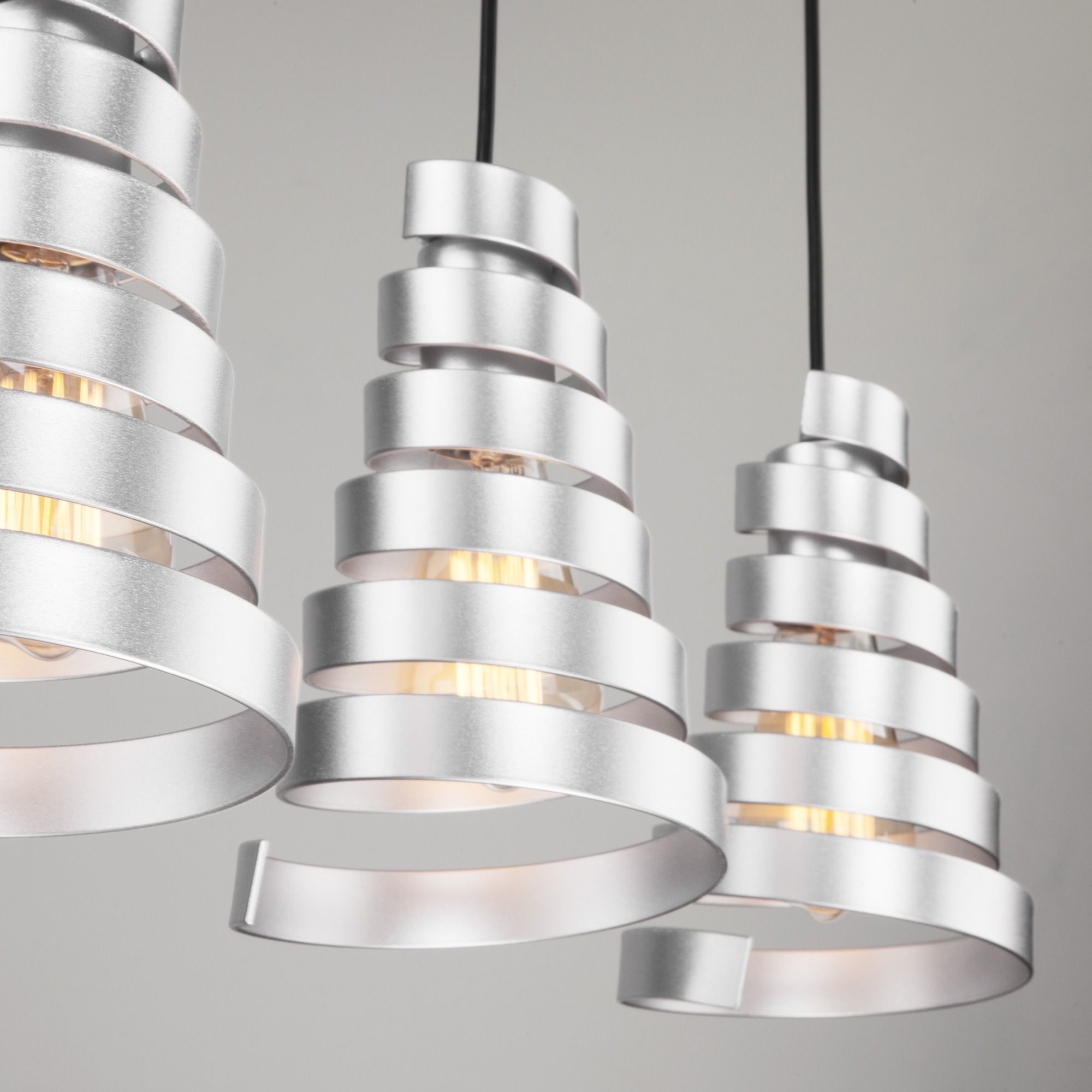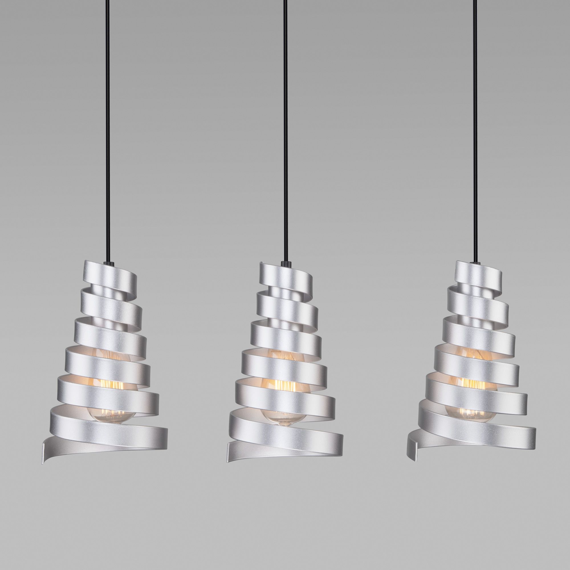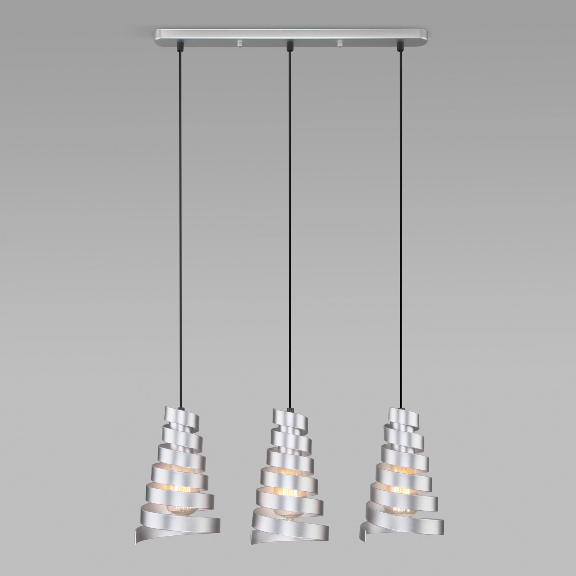 Светильник с металлическими плафонами в серебряном цвете. Подвесной светильник легко устанавливается на любых потолках при помощи монтажной планки.