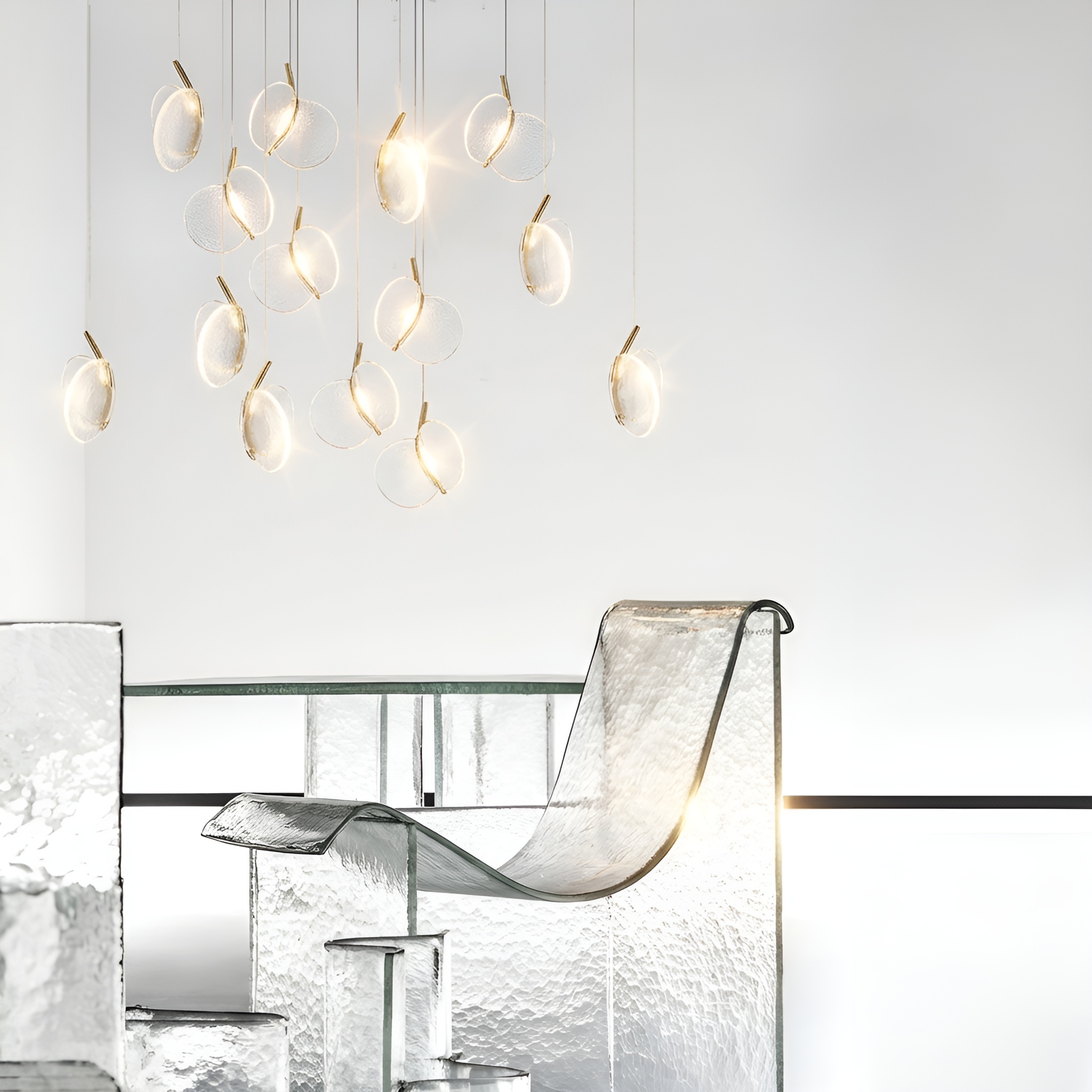 При включении свет мягко рассеивается через фактуру стекла, образуя на стенах и потолке деликатные блики. Освещение получается камерным и уютным, без резкой яркости, — таким, какое хочется видеть над прикроватной тумбой, небольшим столиком, в зоне отдыха или над барной стойкой.