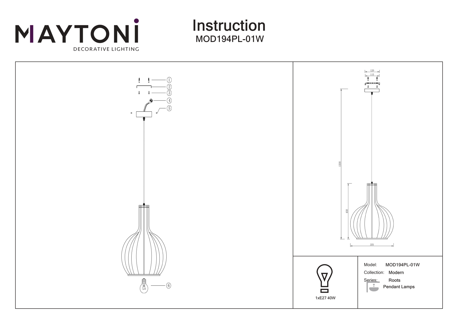 Подвесные светильники Maytoni MOD194PL-01W Черные в Череповце