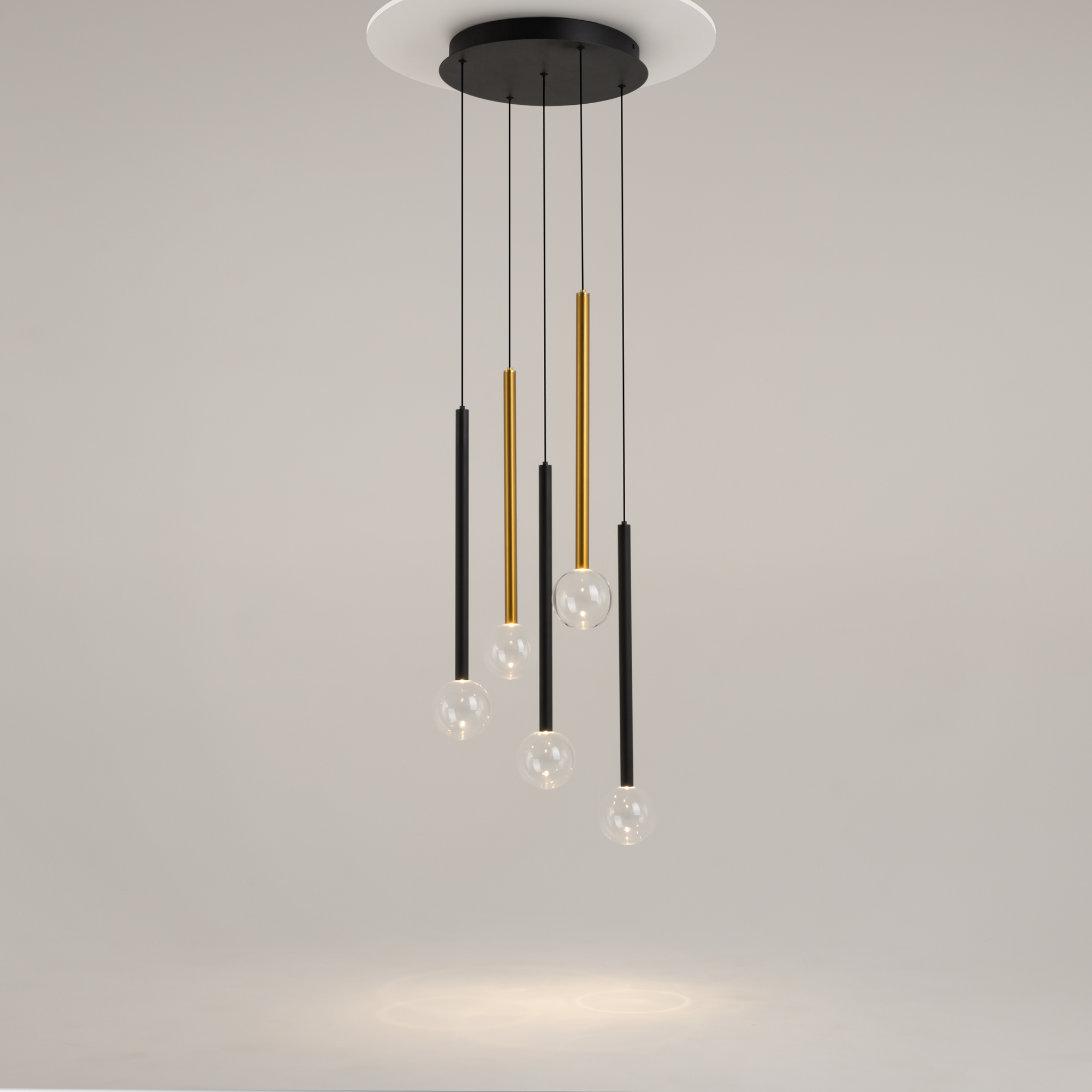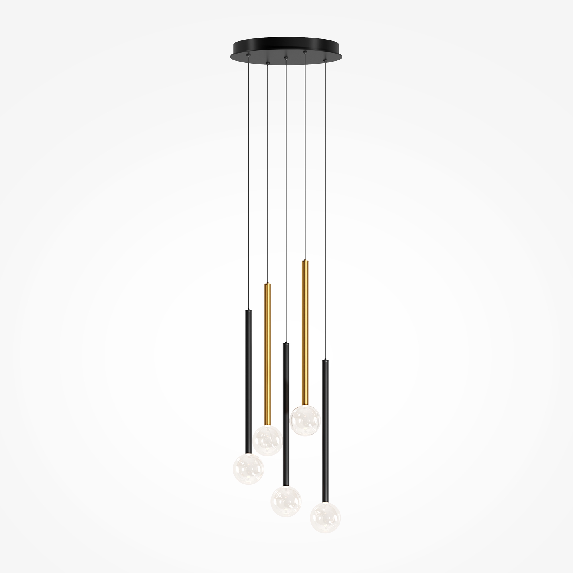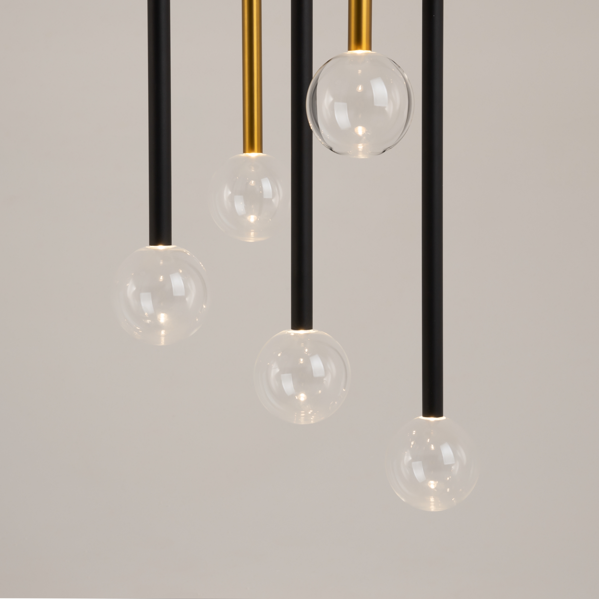 Цвет арматуры — черный, латунь, комбинация черный и латунь. Материал арматуры — металл. Цветовая температура 3000К. Оригинальный «невесомый» дизайн с тонкими металлическими трубками и стеклянными шарами-плафонами. LED-источники света. Регулируемая длина провода подвесных светильников, 3 метра, подходит для помещений с высокими потолками. Каскадная композиция на 7 и 15 плафонов оснащена проводом длиной 3,5 метра для эффектных дизайнерских решений. Подходит для высоких потолков. Парящие модели для создания легкой, воздушной атмосферы в интерьере.