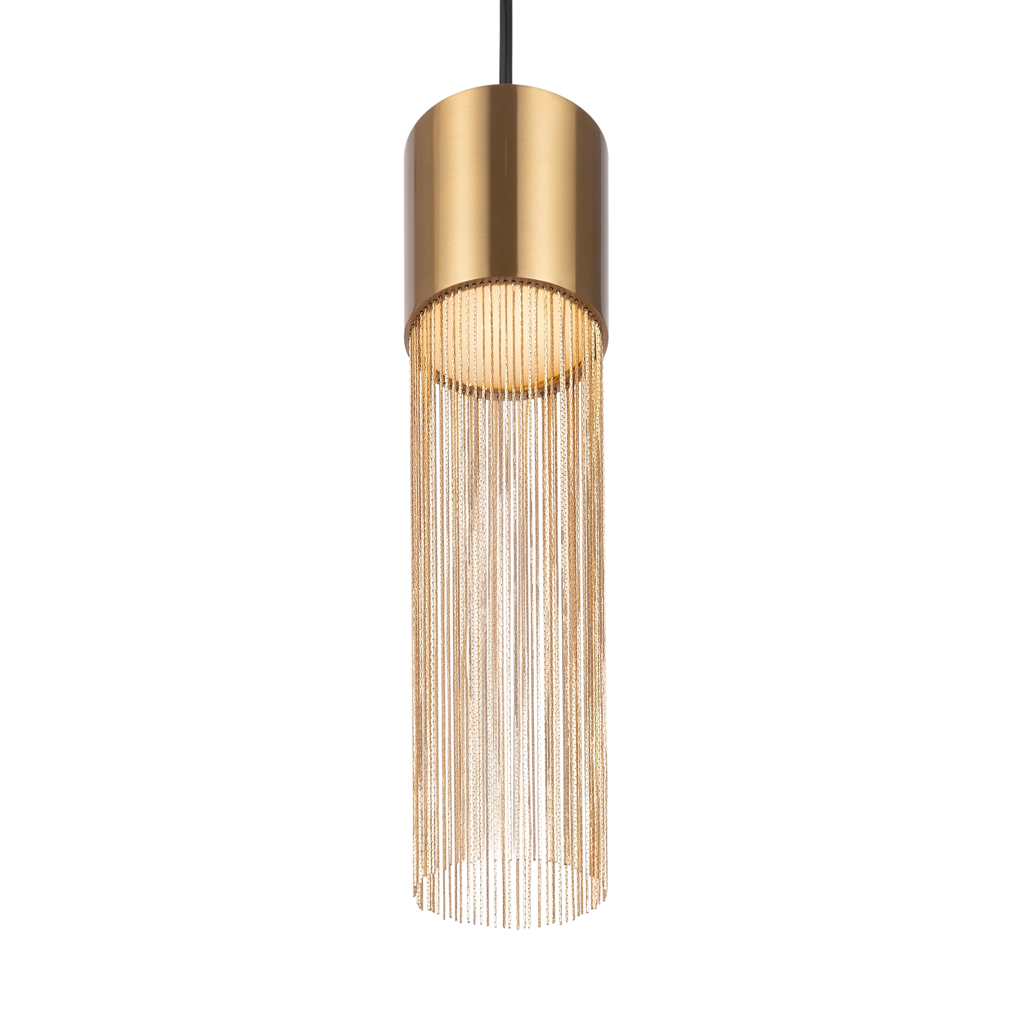 Металлическая арматура, цвет - золото. Мотивы ювелирного искусства в дизайне. Изящные цепочки на корпусе светильника создают переливы бликов. LED источник света. Цветовая температура - 3000К. Регулируемая высота подвесного светильника.