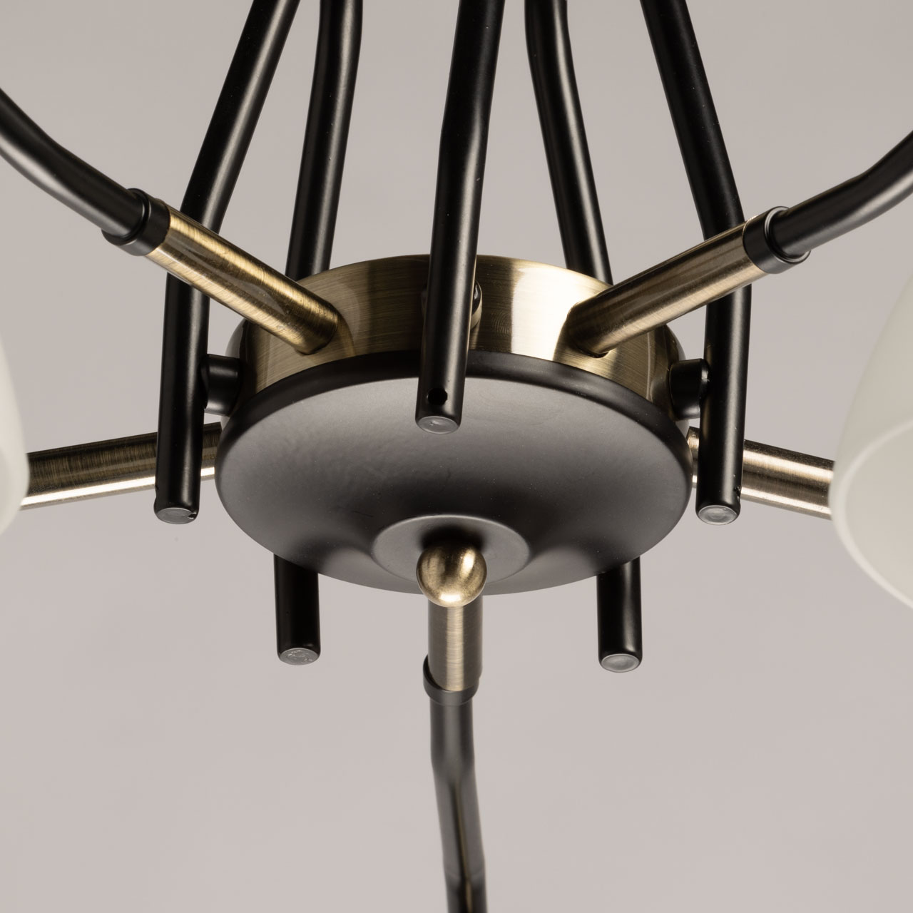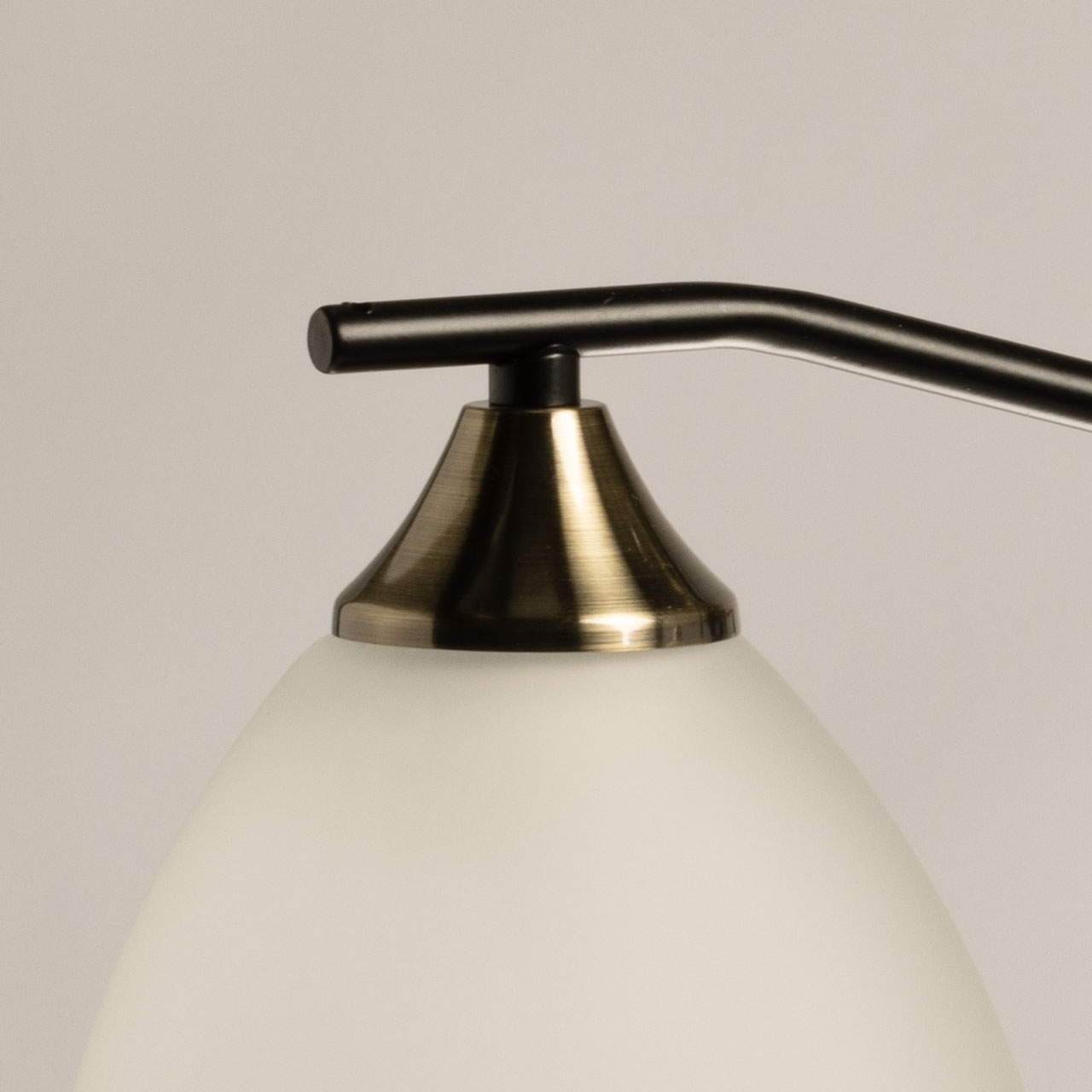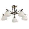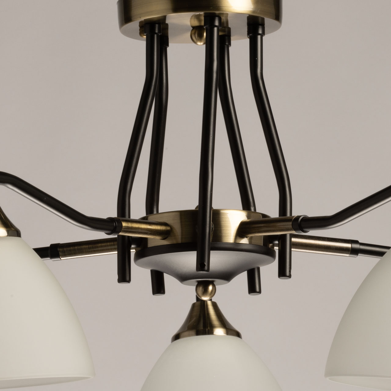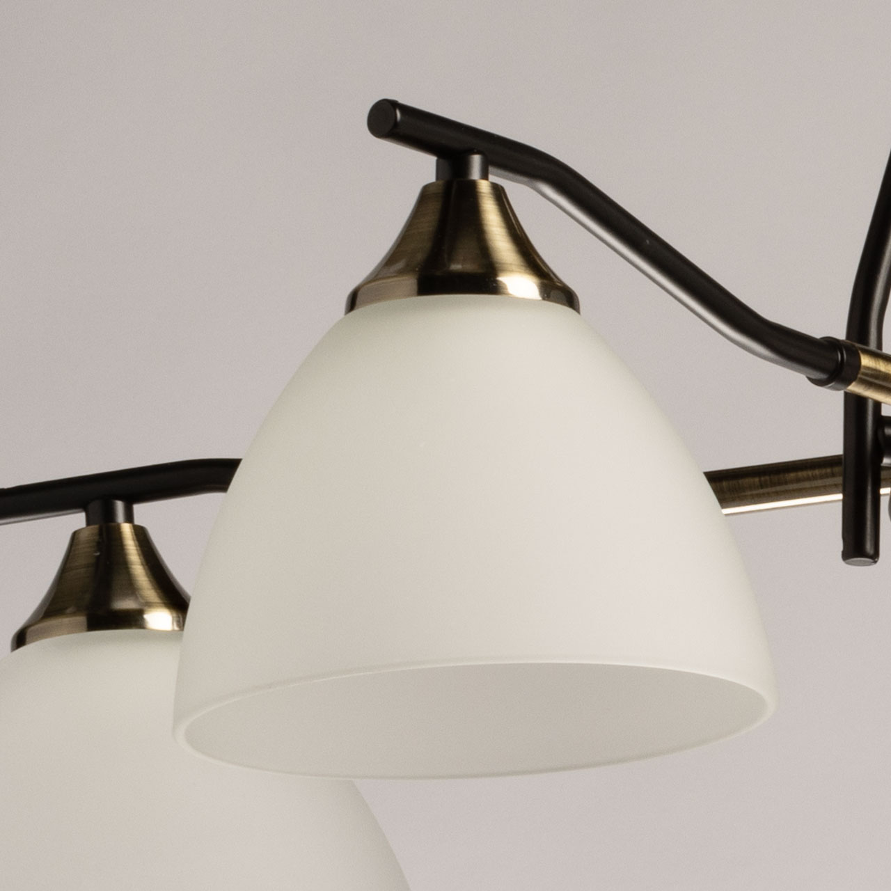 Основание светильника выполнено из металла и окрашено в черный цвет. Отдельные элементы основания гальванизированы в цвет античной бронзы. Стеклянные плафоны отлиты в форму и окрашены в белый цвет изнутри.