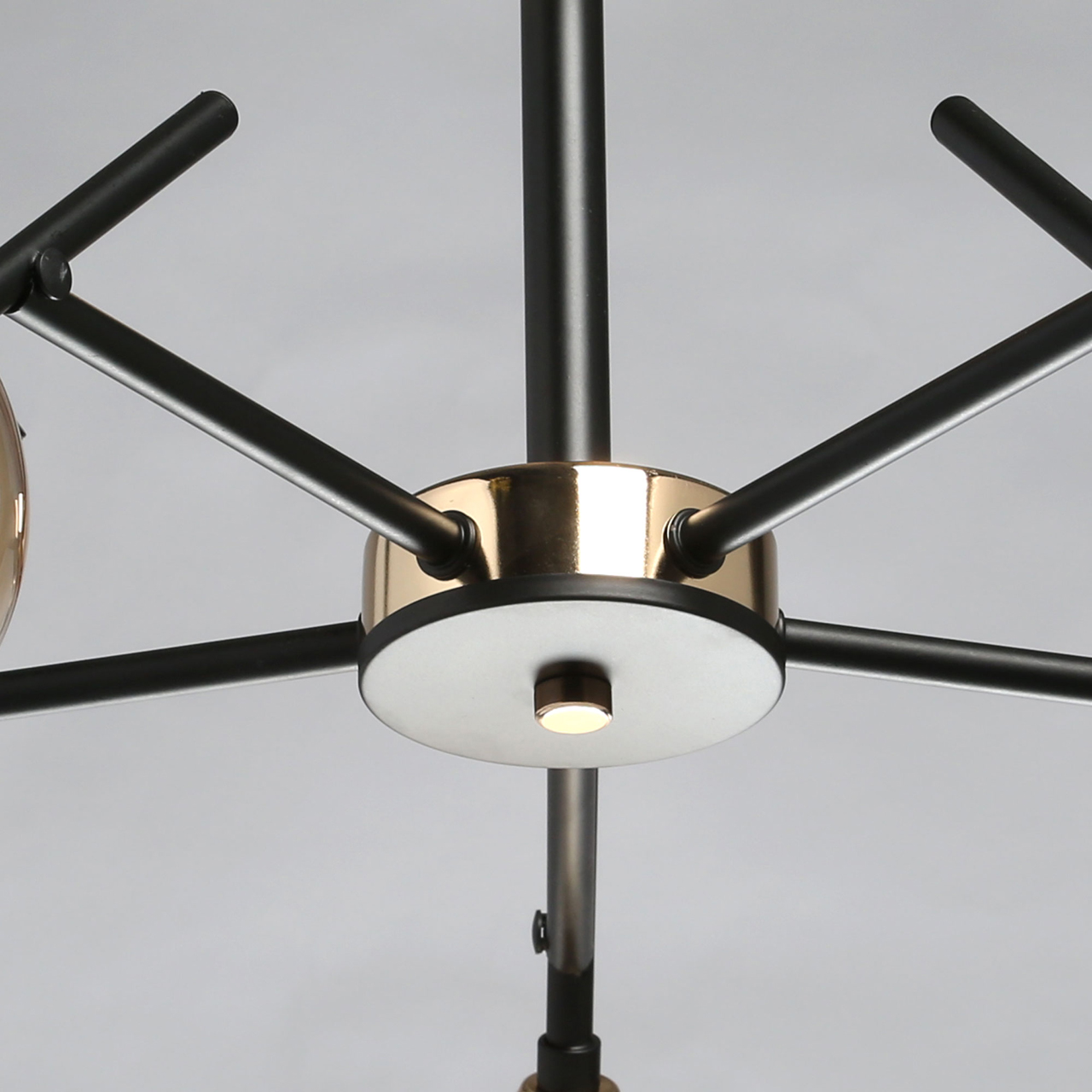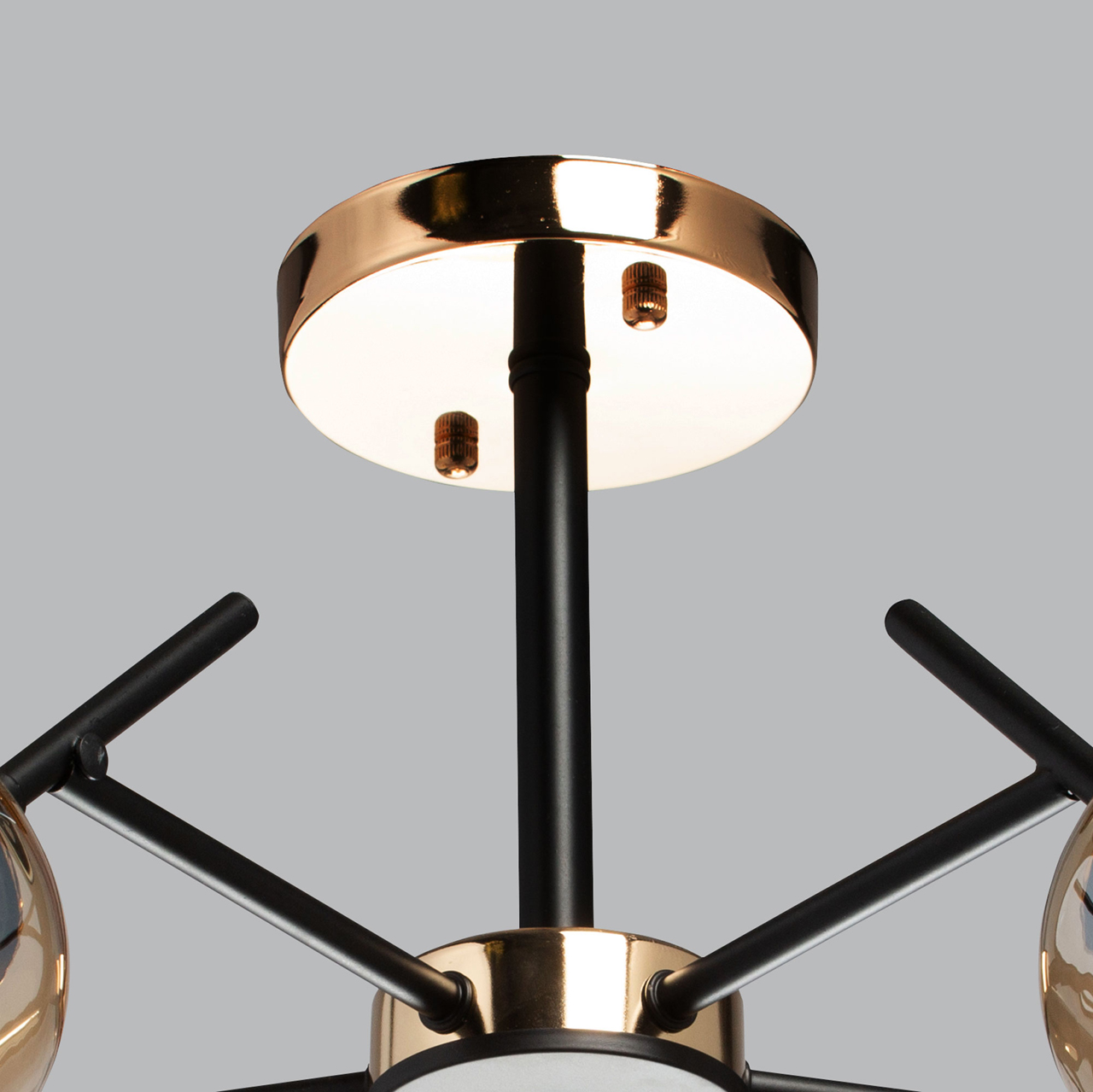Основание светильника выполнено из металла и окрашено в черный цвет. Отдельные элементы основания гальванизированы в цвет золота. Стеклянные плафоны гальванизированы в цвет шампань.