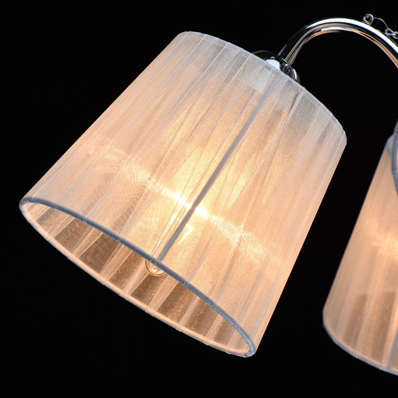 Основание светильника выполнено из сплава металла и гальванизировано в цвет хрома. Абажуры из прозрачной органзы белого цвета с термостойким акрилом внутри. Абажуры отделаны кантом сверху и снизу, прошиты. Светильник декорирован металлическими цепочками в цвет основания и прозрачным хрусталем в форме шара.