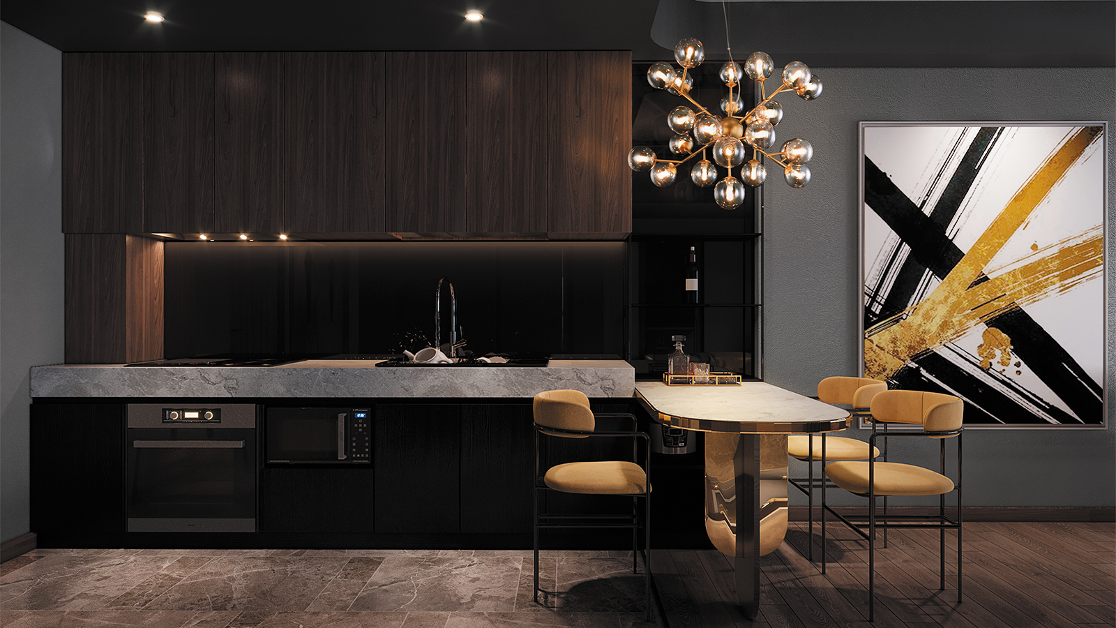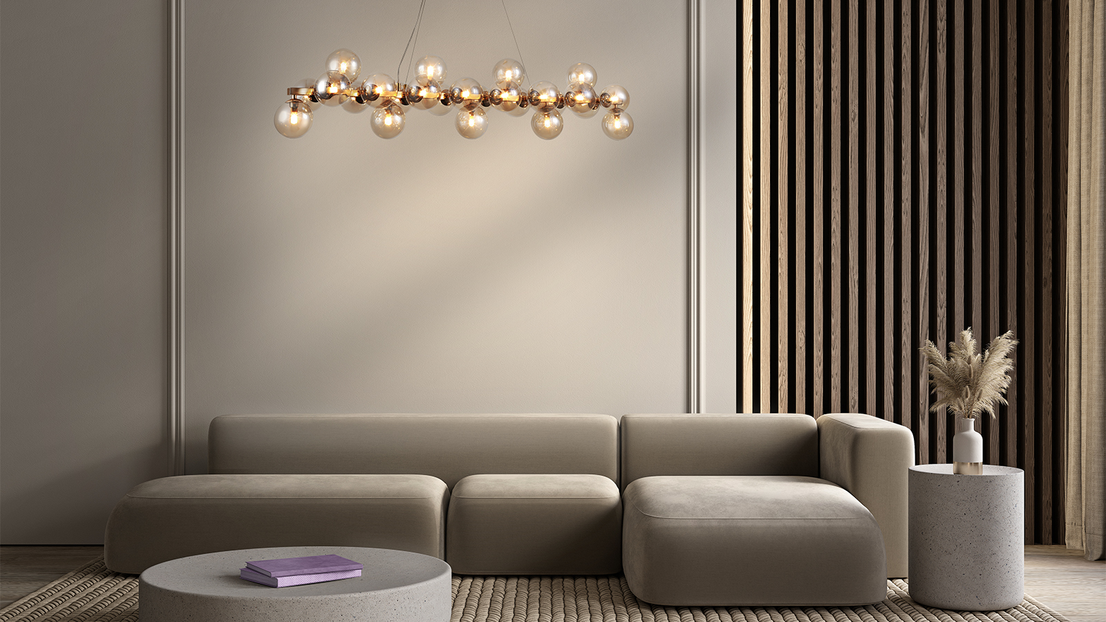 Металлический корпус в золотом цвете, словно ветви, на которых расположены стеклянные плафоны из выдувного стекла янтарного оттенка. Такое оформление придает светильнику современный и стильный вид. Выдувное тонированное стекло создает парящий эффект, органично дополняя минималистичный современный интерьер. Размеры устройства составляют 600 мм х 200 мм, что позволяет легко интегрировать его в любое интерьерное пространство. Модели, входящие в коллекцию Dallas MOD545, идеально подойдут для размещения в зоне гостиной, спальни, кабинета или офиса, оформленных в стиле хай-тек, а также для размещения в зоне барной стойки или острова в столовой, позволяя использовать в тандеме потолочные люстры, подвесные светильники с горизонтальным и вертикальным размещением и настенные осветительные приборы.