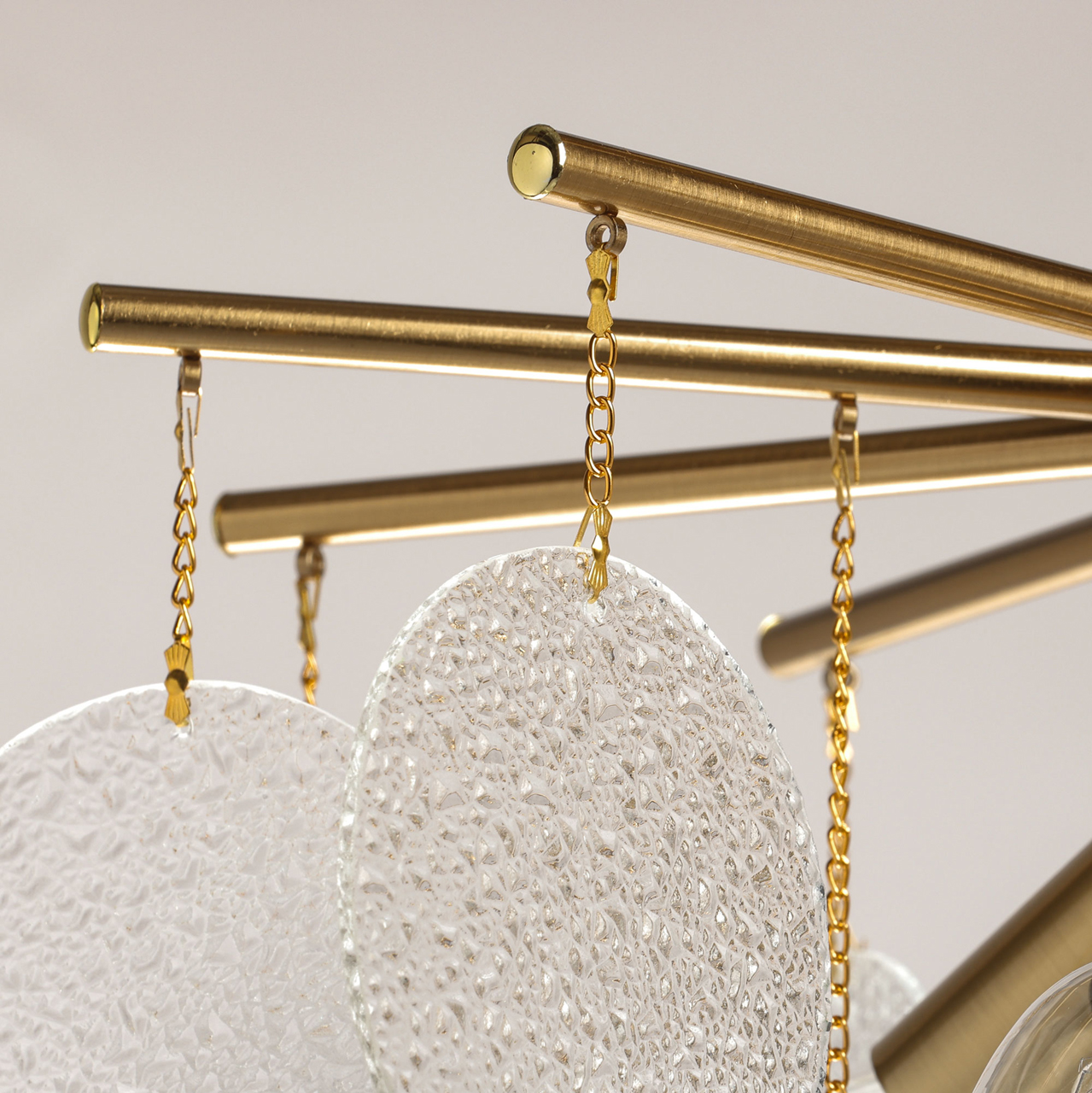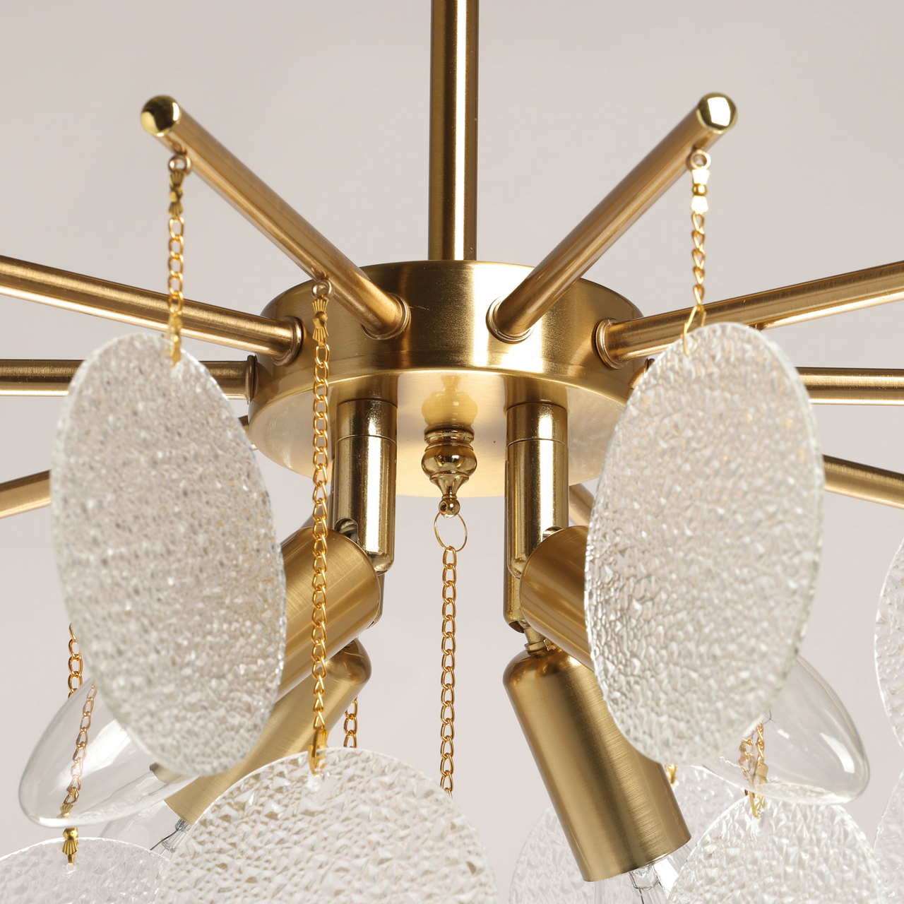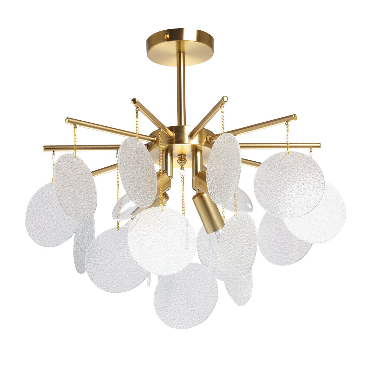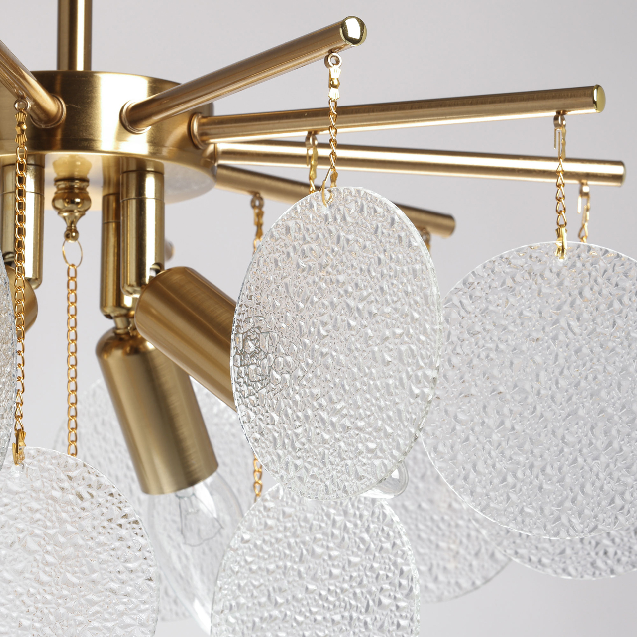 Металлическое основание подвесной люстры гальванизировано в цвет латуни. Люстра декорирована подвесками из фактурного полупрозрачного стекла.